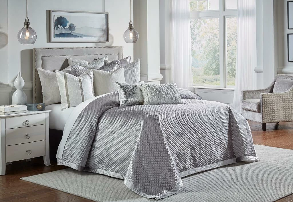 Dreams Collection- Light Grey Crushed Velvet with 1″ Diamond quilting with 2″ flange. Piping in Grey Velvet. Reverse- 100% Matching cotton