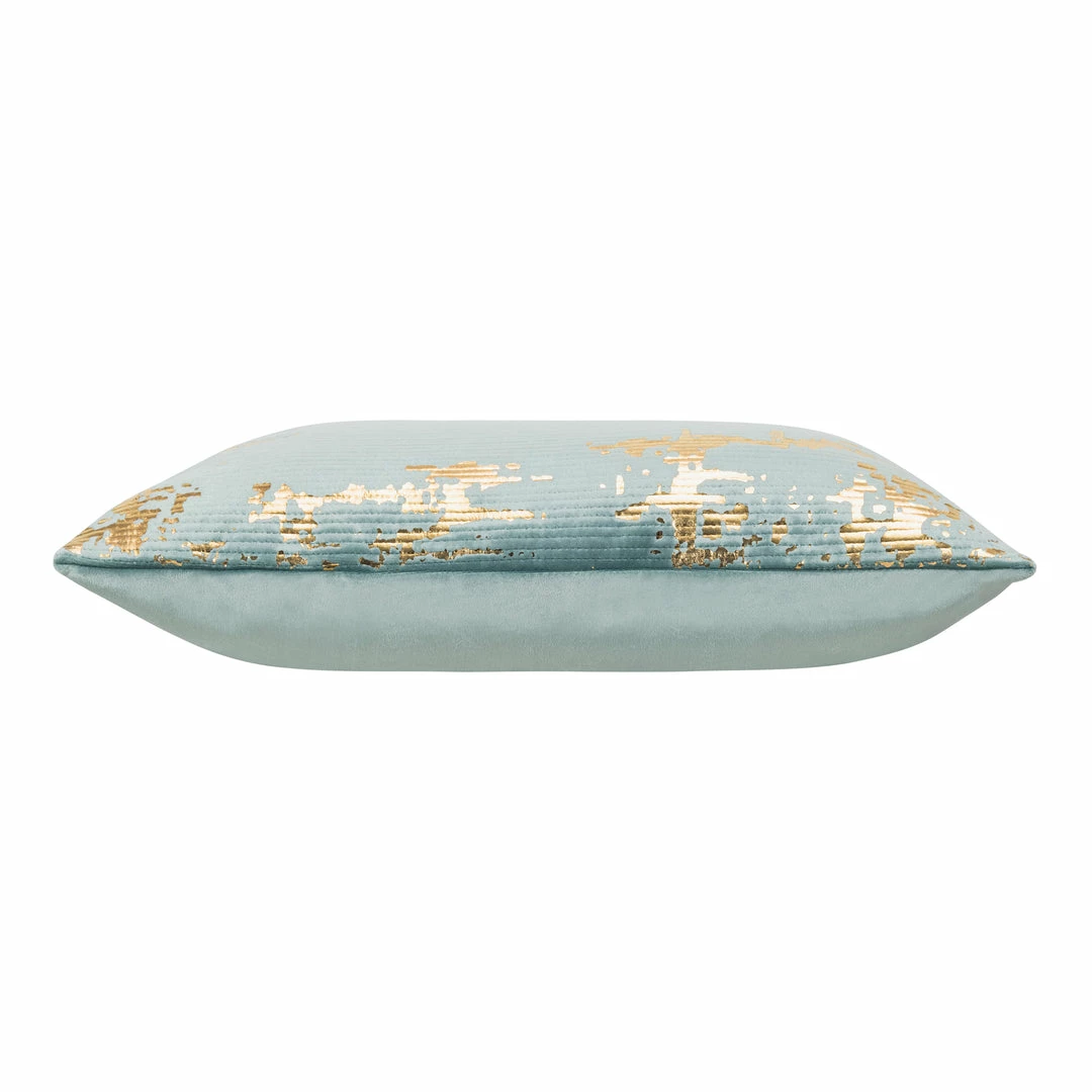 Oblong Blue/Green Velvet with Quilting and shiny gold foil print pillow with knife edge. Back: matching velvet.
