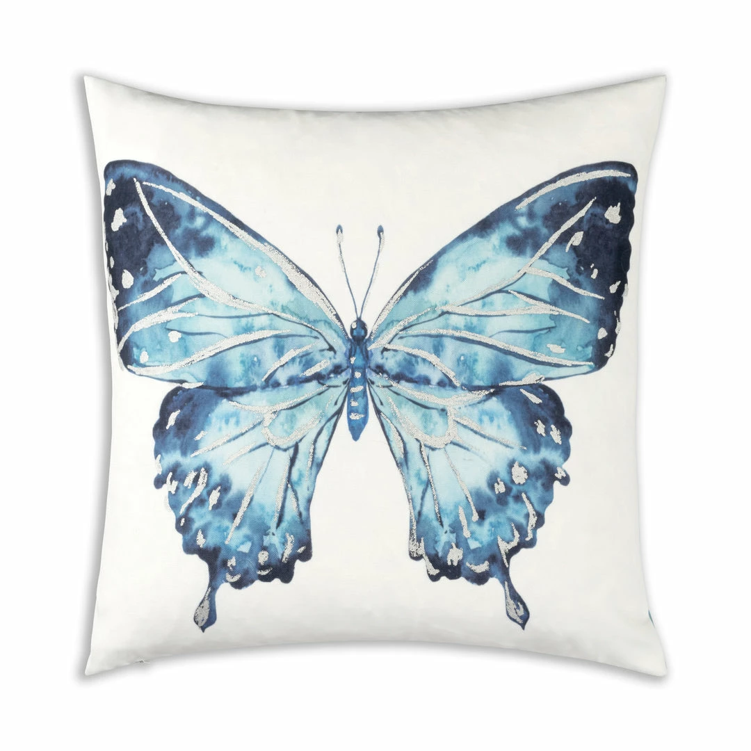 TSPUN Digital printed fabric in Butterfly print blues with outdoor rose gold metallic print. Outdoor compatible insert. Knife edge. 100% Polyester. Insert sewn in.