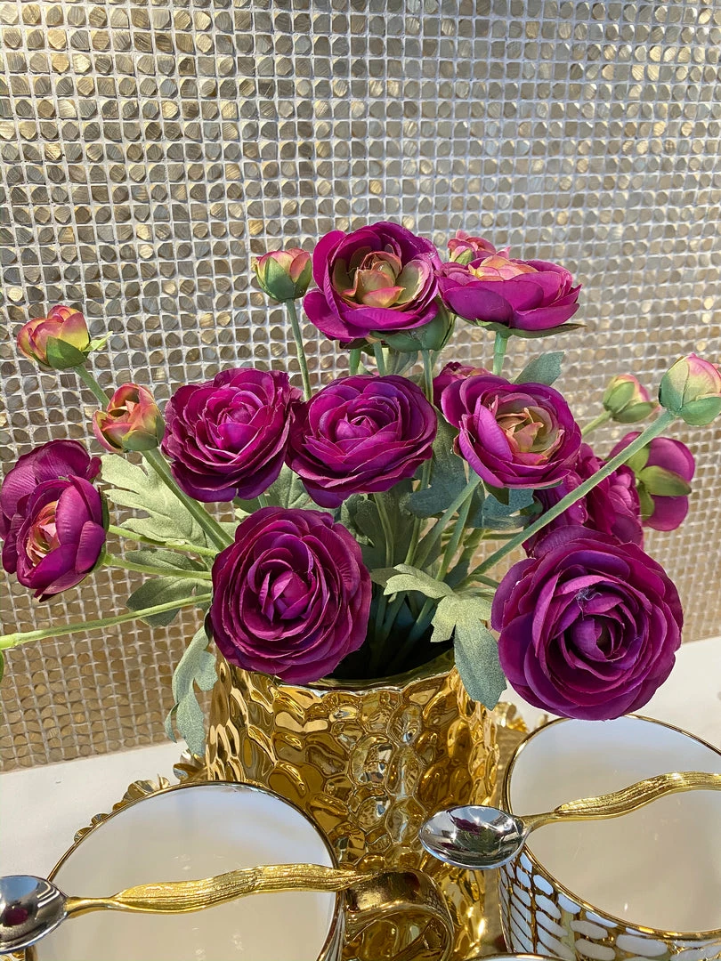 Description: Looking to add a pop of color to your home? These breathtaking deep purple ranunculus stems are a great way to add a dramatic touch!