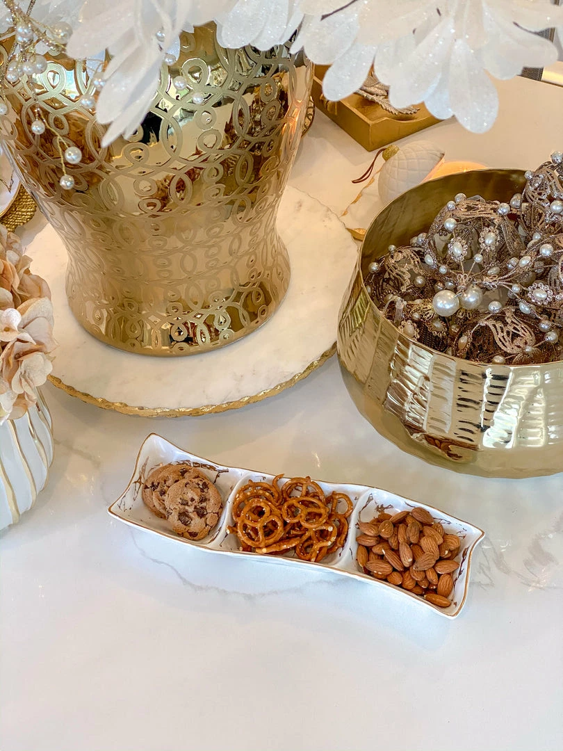Description: Offering a new take on a traditional dish. The metallic gold marble print gives nice contrast to the stark white base. Three serving sections can hold your favorite assortment of fruit and nuts, or elegantly display your household decor.