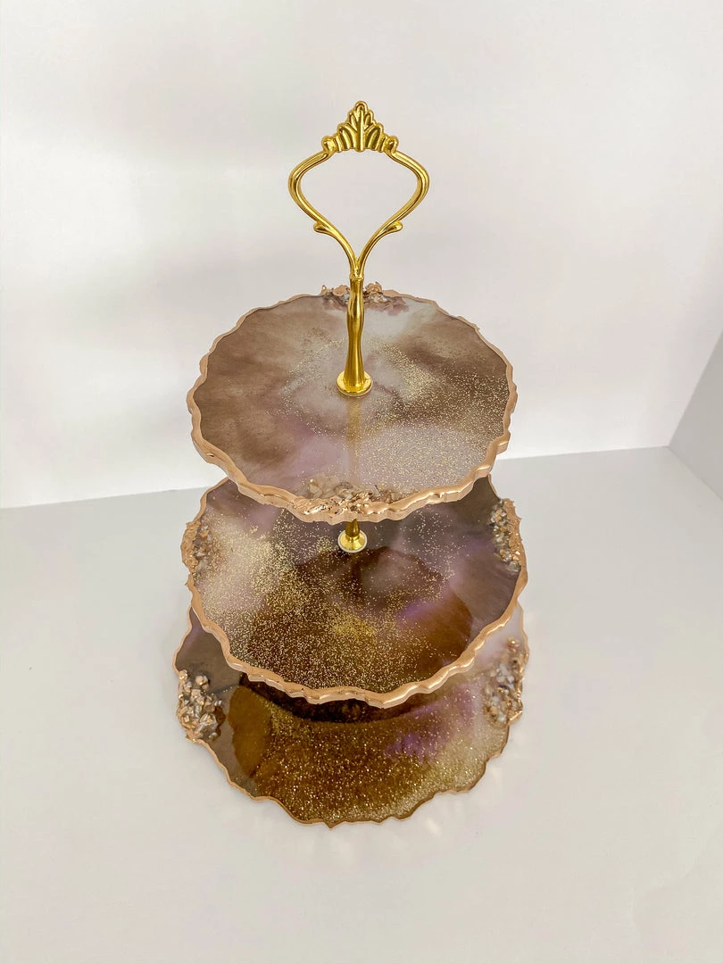 Description: This beautiful cake stand will add unique elegance to your serving display! Each piece is handmade with a glossy resin finish featuring gold and mauve colors, and encrusted with gold colored stones. Complete with three full tiers and gold colored hardware, this is the unique luxury you need!