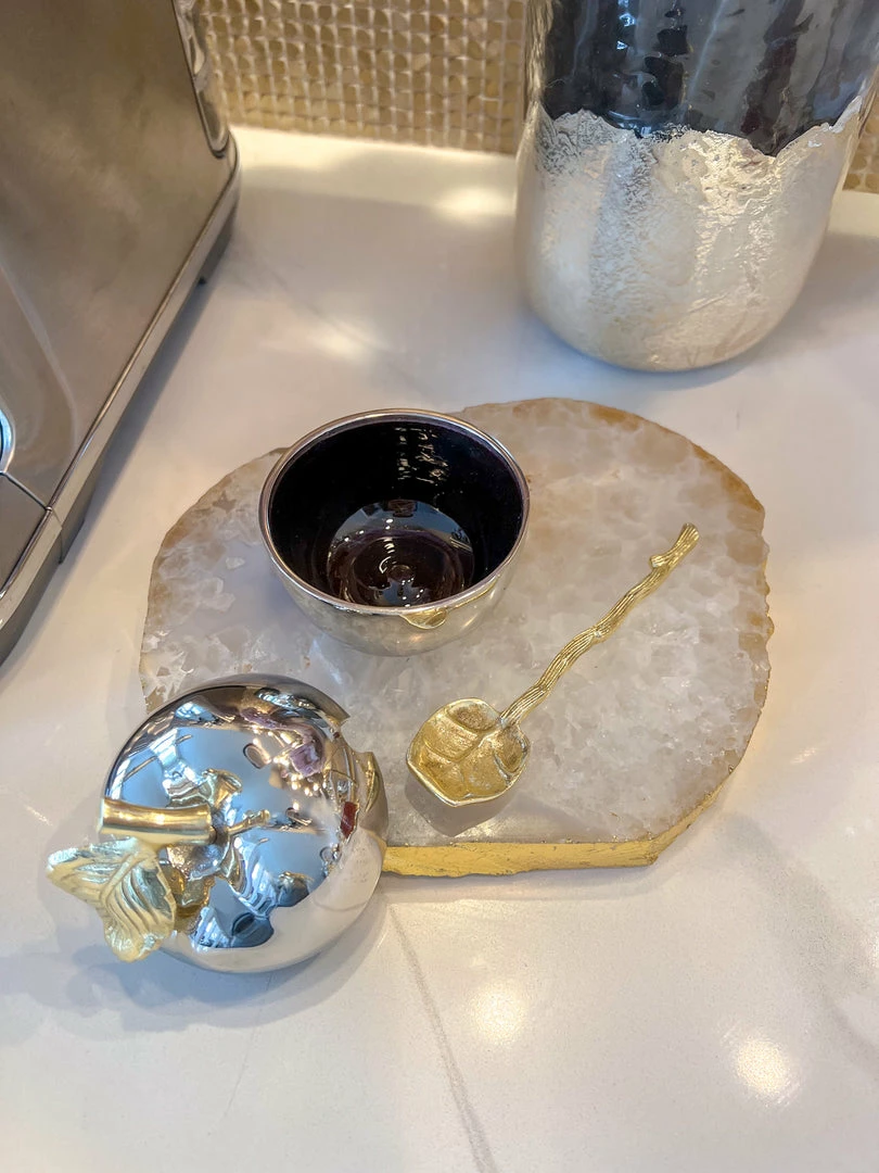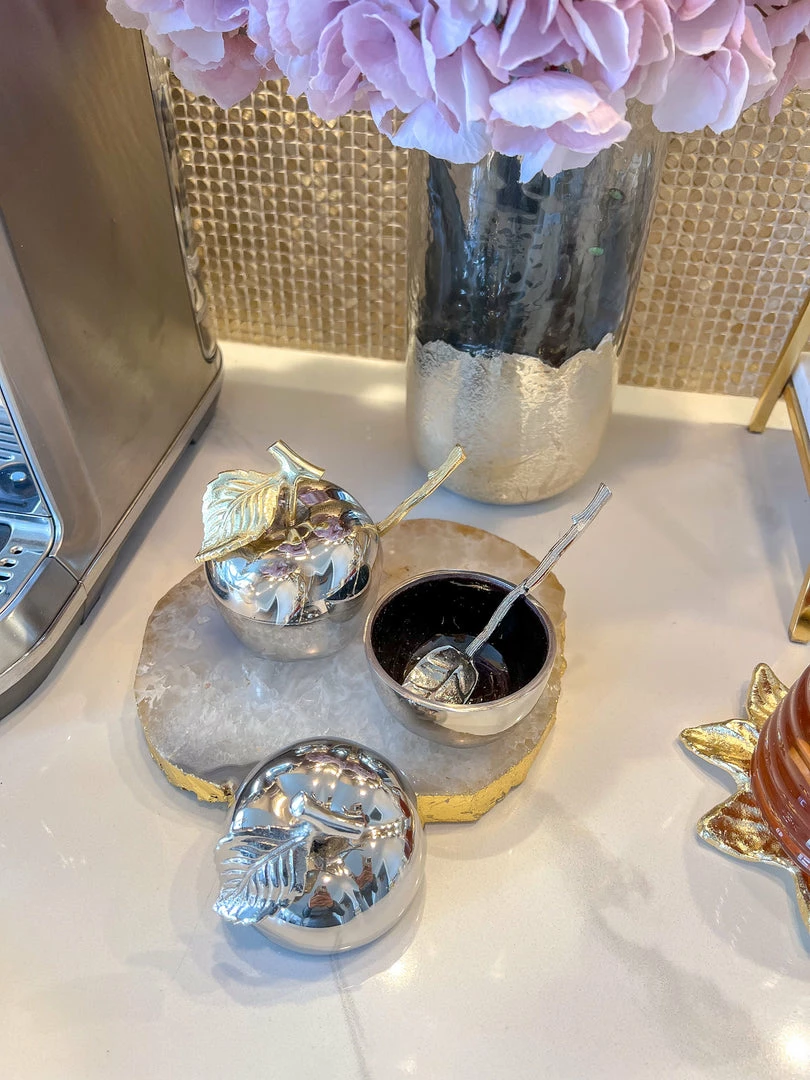 Description: This is the cutest little apple-shaped jar with a branch handled leaf spoon. Use for holding sugar or spices. Available in Silver and Gold and Silver. Individually priced.