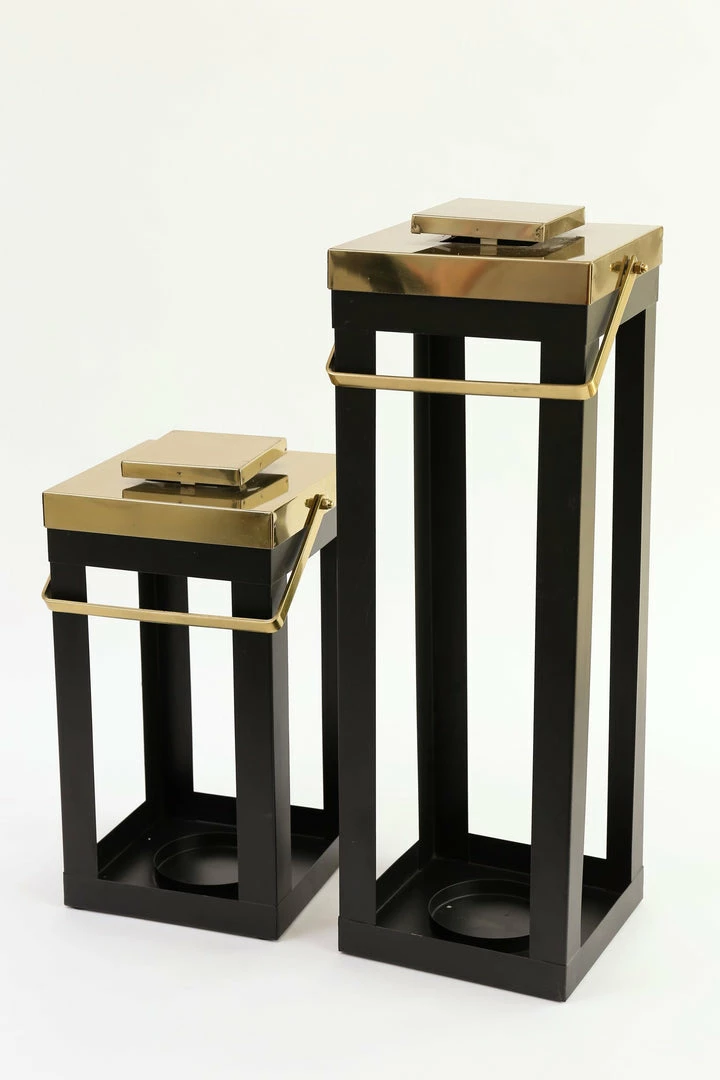 Description: This striking lantern will make a great accent to your home decor! The bold black finish and gold top add a modern twist to this glamorous item. Bets suitable for indoor use or covered patios. Available in 2 sizes!