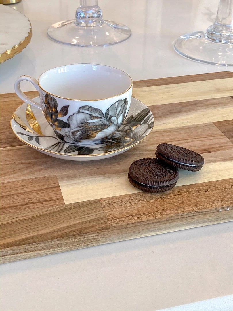 Description: This beautiful cup and saucer is made of elegant porcelain and finished with a stunning design! The design features black and grey peony flowers with gold details. Serve yourself a relaxing drink with a stylish teacup!