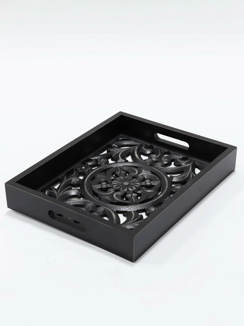 Description: We love these wood trays! This set of 3 trays features a unique abstract cut out design with stunning details!