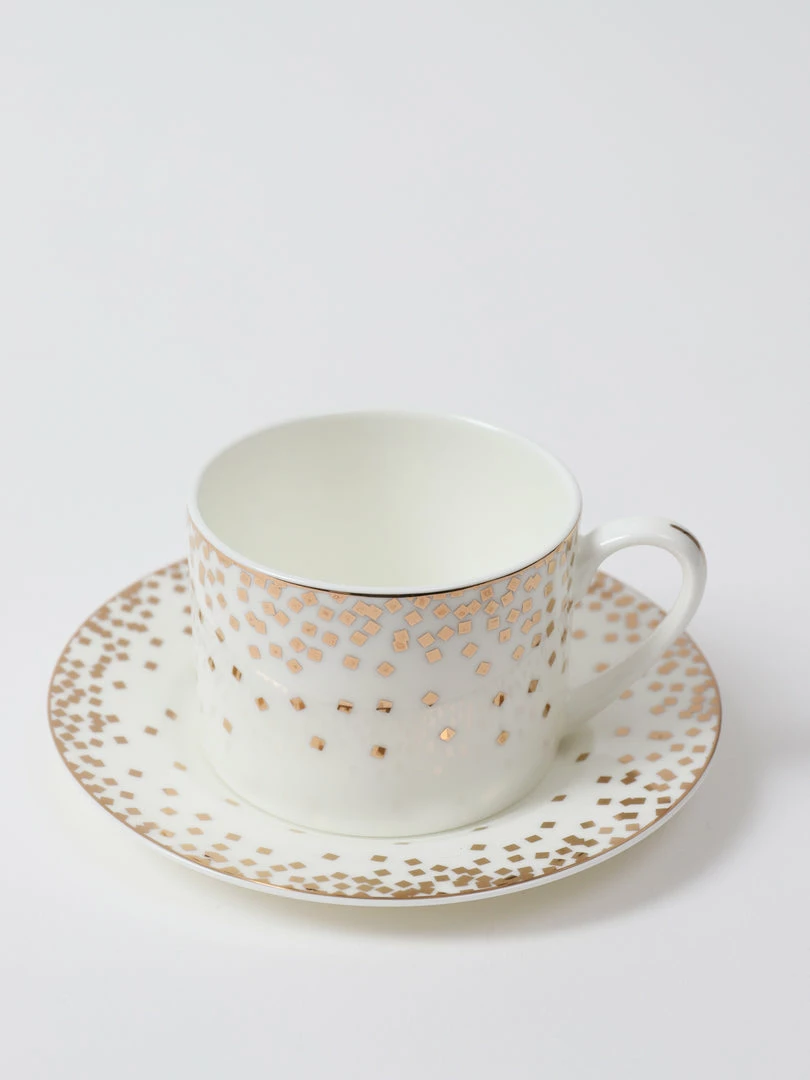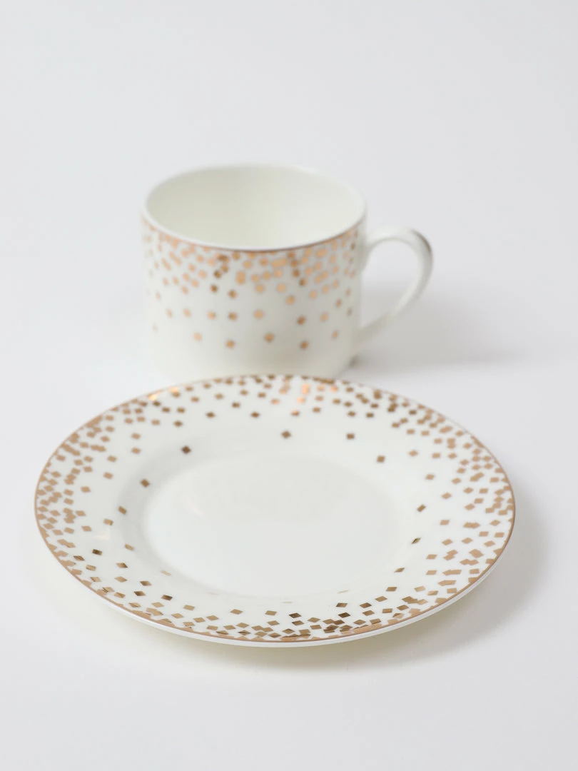 Description: What a gorgeous dotted bone china cup and saucer set this is! One set is one saucer and one cup.