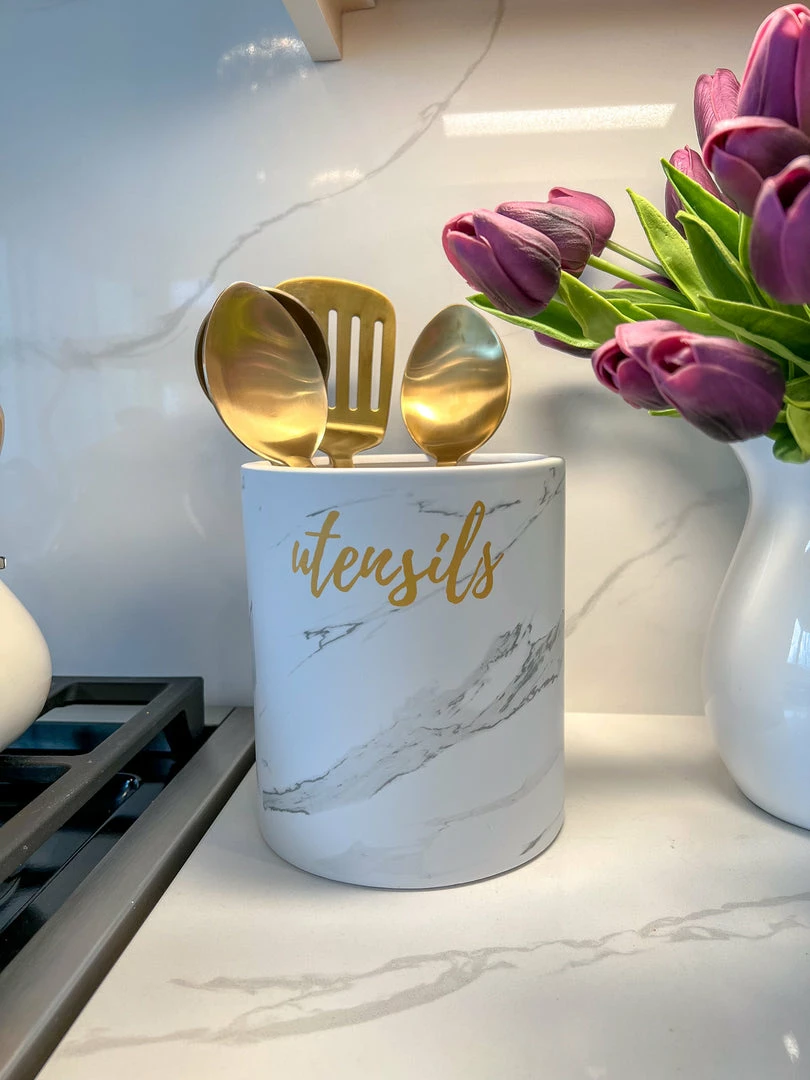 Description: This all white, marbled patterned utensil holder is a very cute addition to your kitchen! Fill it with your favorite utensils and server sets for an elevated yet practical look.