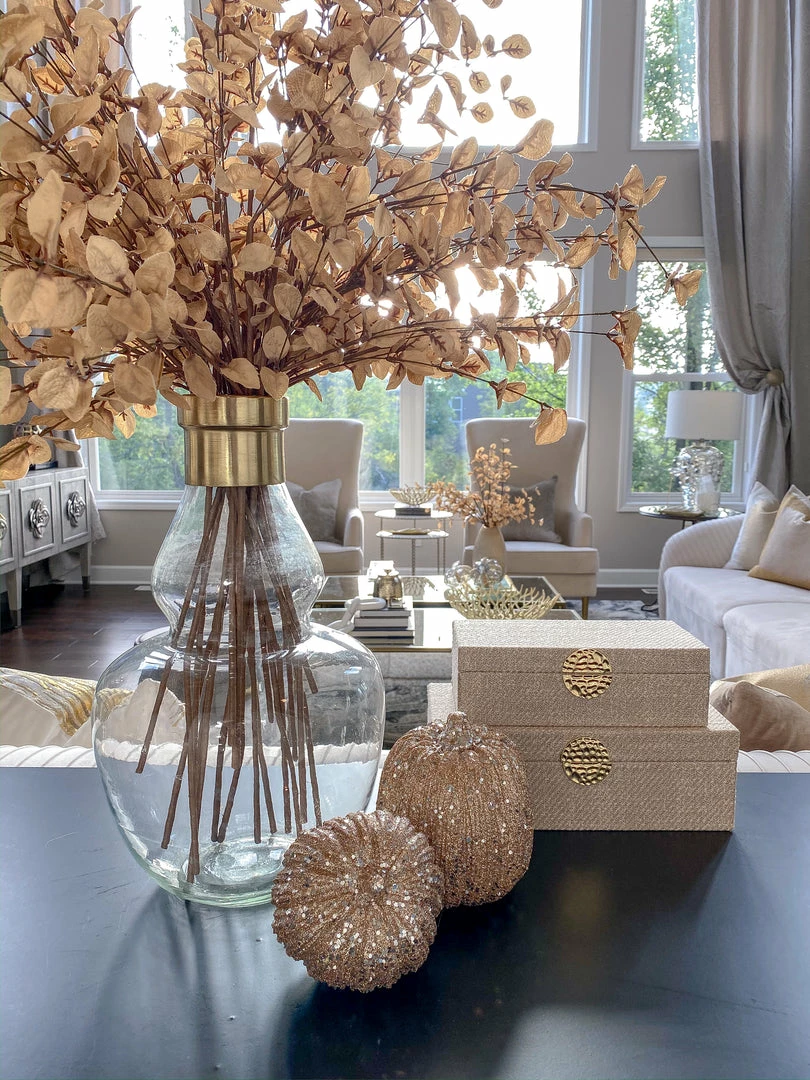 Description: This champagne colored pumpkin is covered in glitter and will add glam to any fall decor vignette.