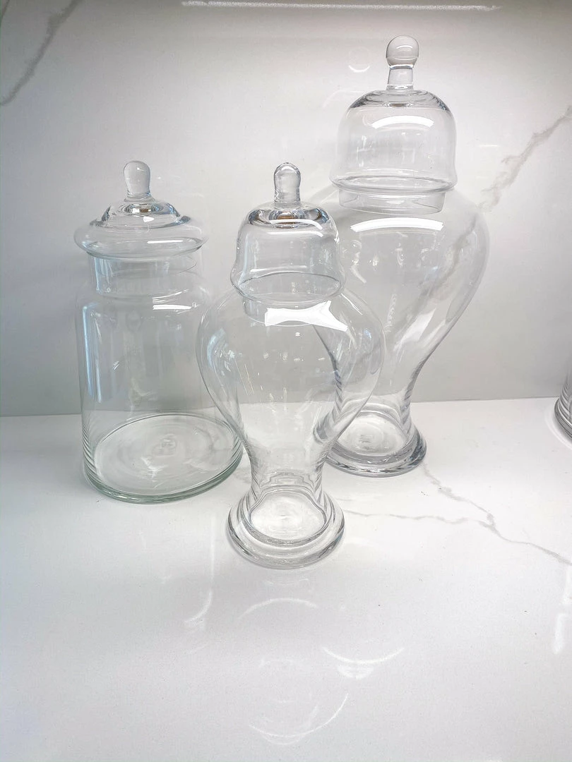 Description: These glass apothecary jars have a fun and interesting shape and are perfect to hold things or as a vase!