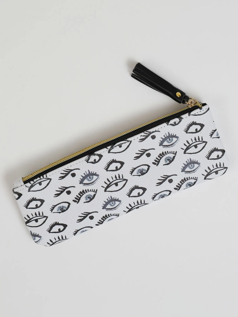 Description: This stylish evil eye pouch is the perfect accessory for travel or makeup storage! The Faux leather finish offers an elegant style, and the look is complete with a gold metal zipper and black tassel charm.