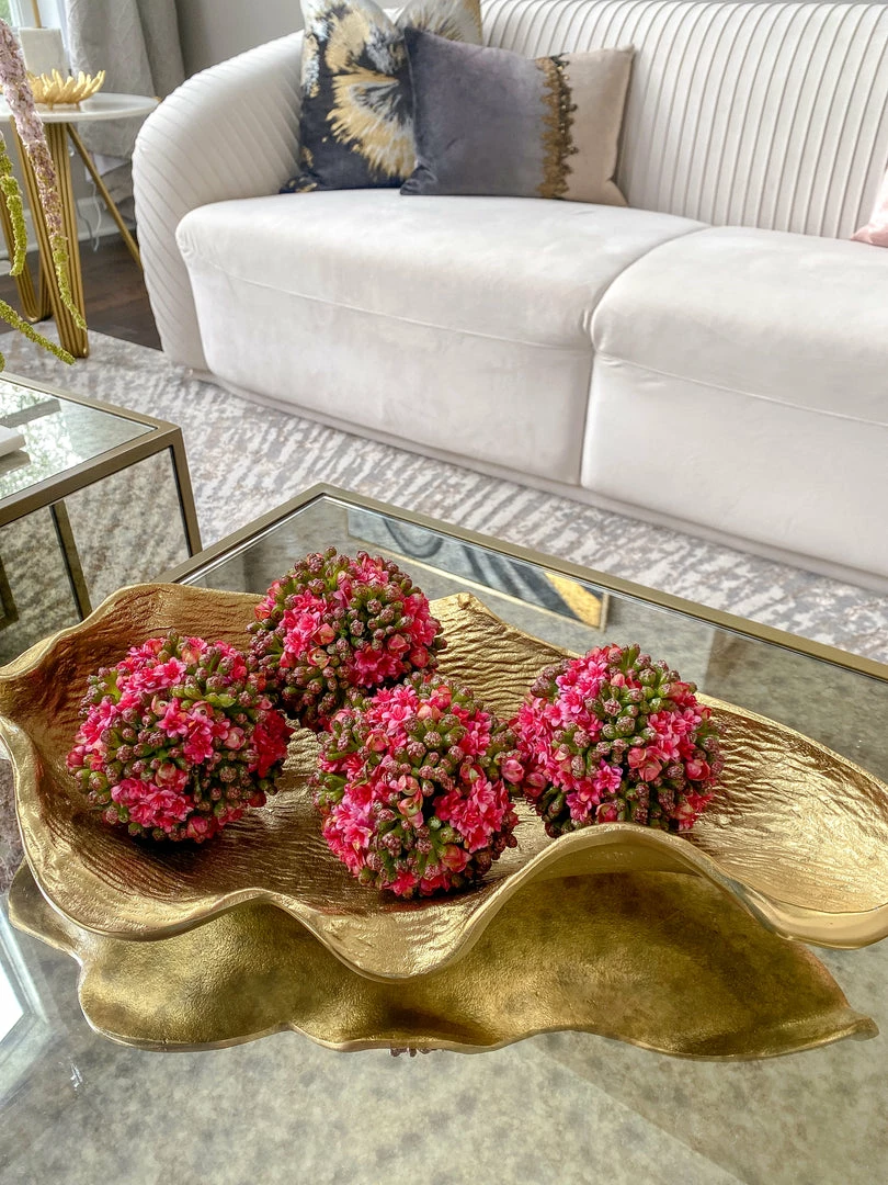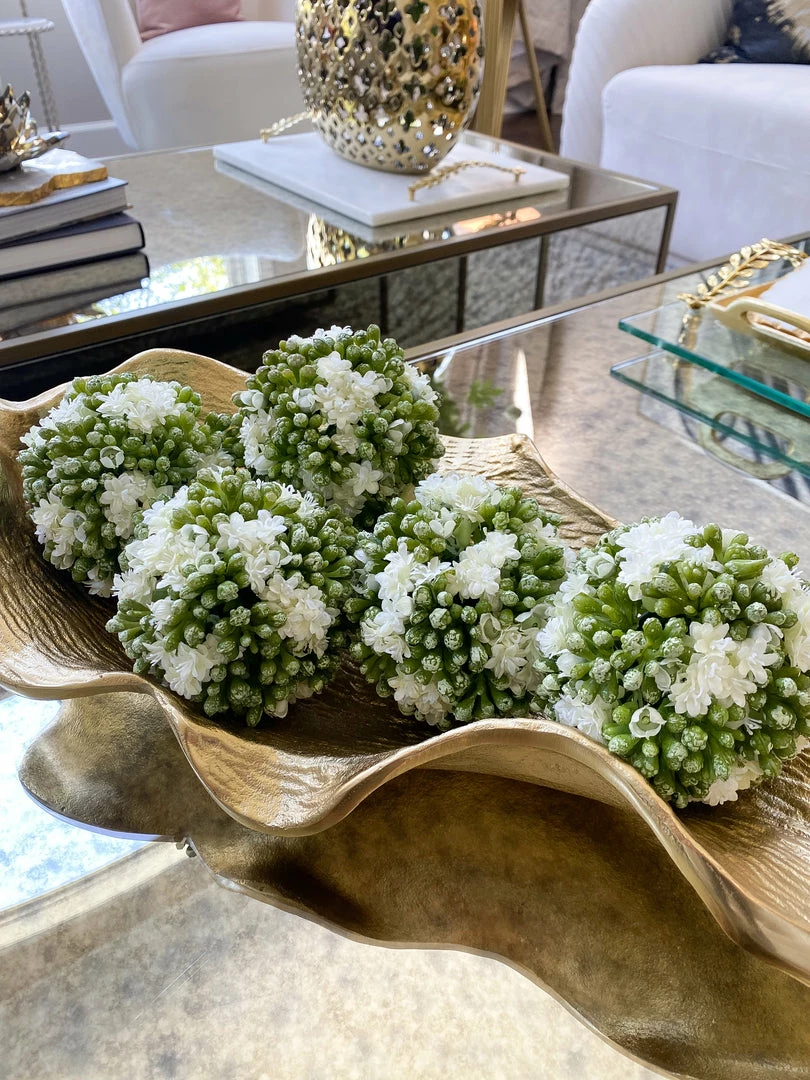 Description: This beautiful floral orb is the perfect filler for the spring and summer! Use these to add some color to your favorite clear vase, or add some texture to a stylish bowl! Available in White, Purple, and Pink!