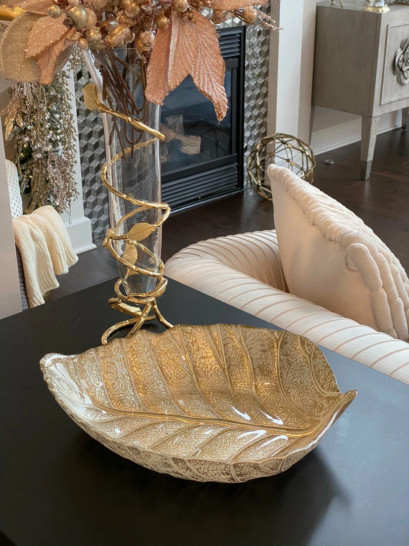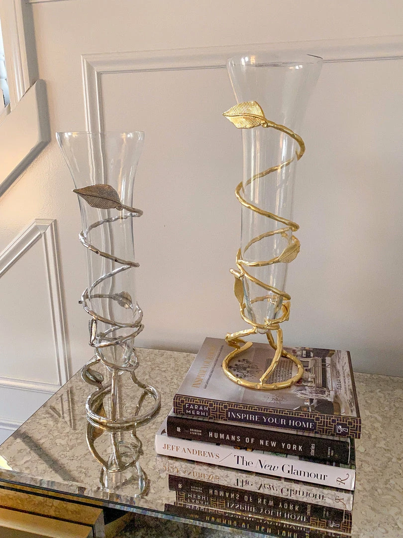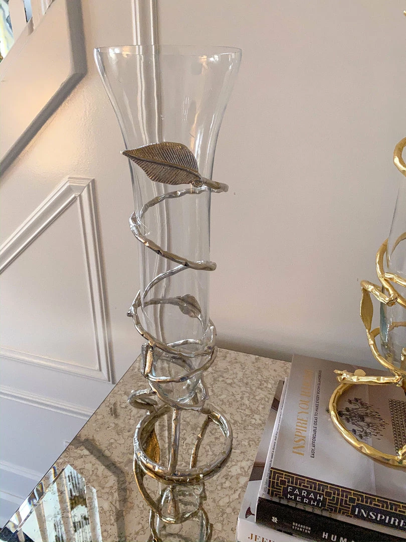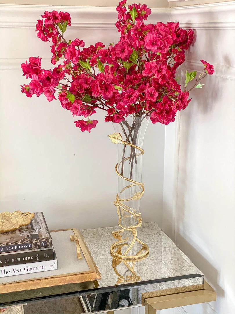 Description: Slim glass vase with stunning gold leaf design that adds a modern and expensive look to any bundle of flowers in any room.