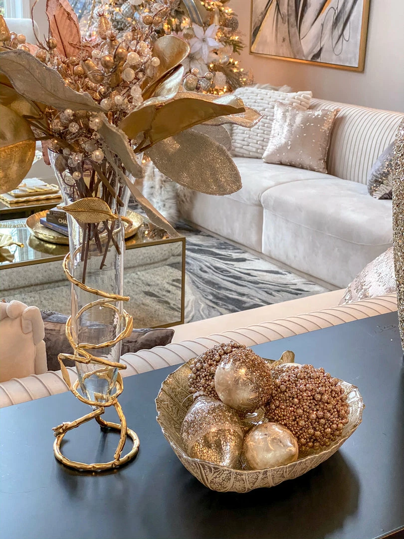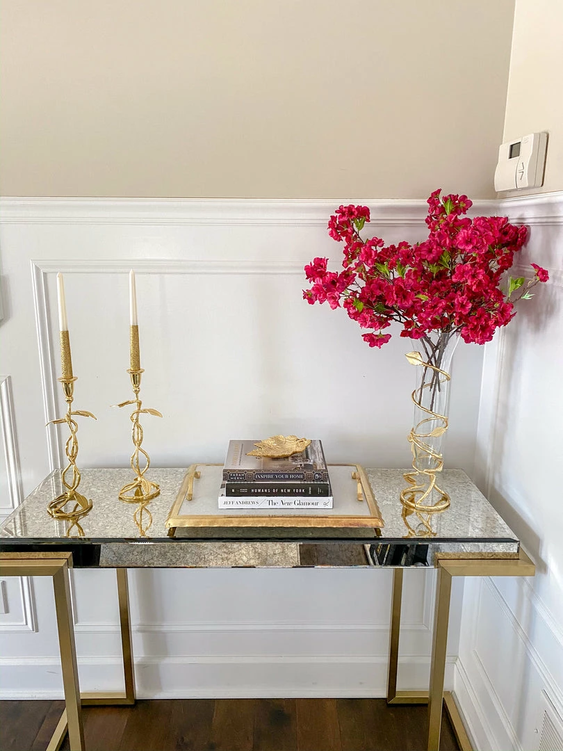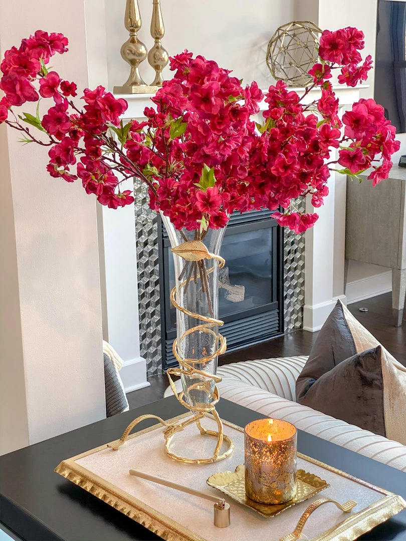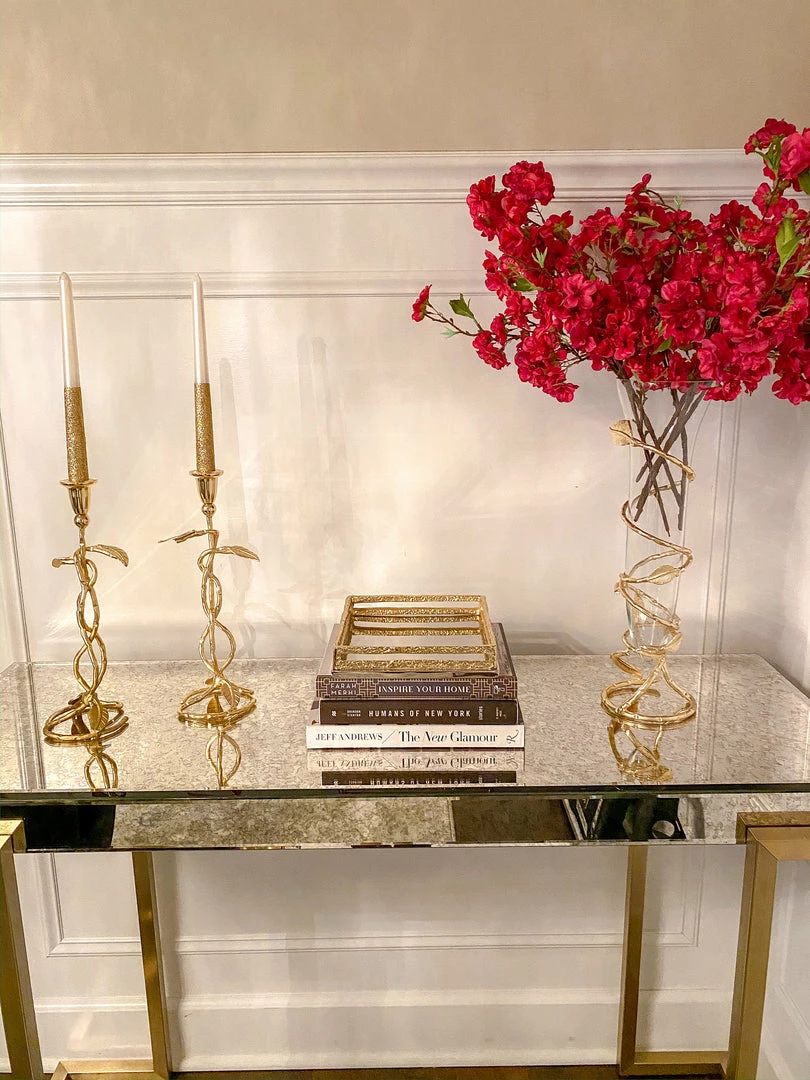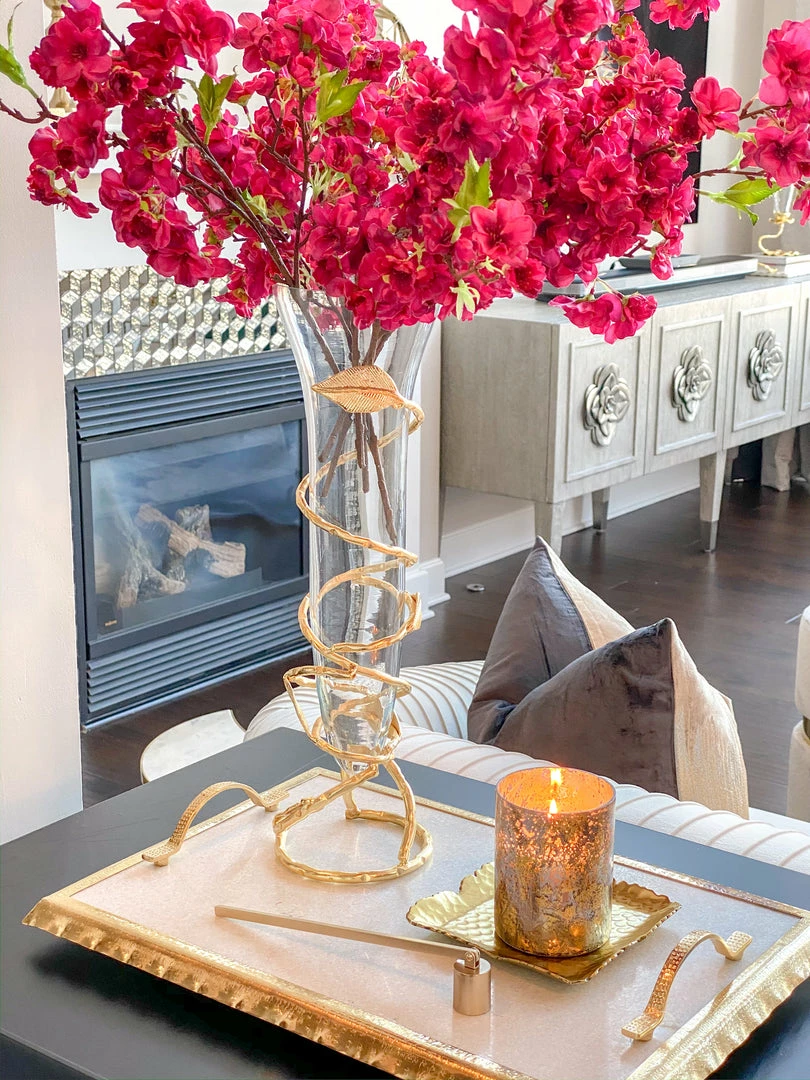 Description: Slim glass vase with stunning gold leaf design that adds a modern and expensive look to any bundle of flowers in any room.