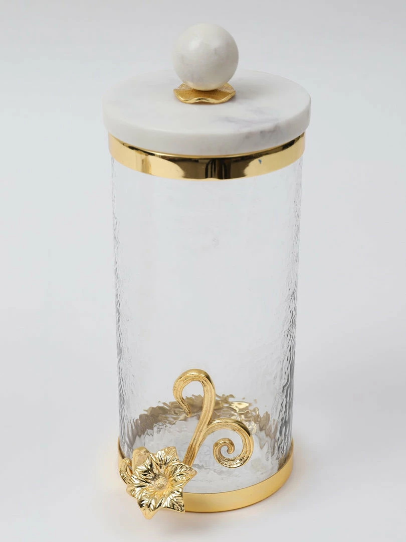 Description: These beautiful glass canisters have a golden flower design and a marble top with a gold accent. What a stunning way to showcase on your coffee station, kitchen counter, or anywhere you need storage. These would look fabulous in your bathroom as well.