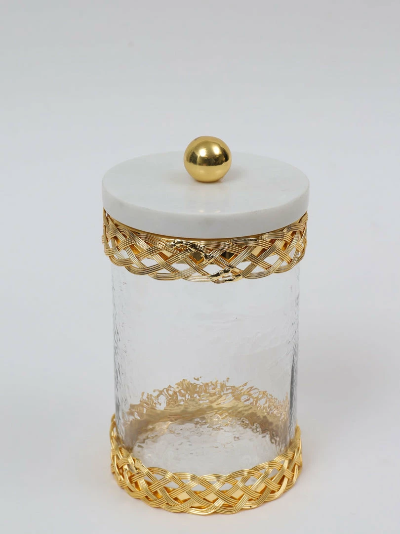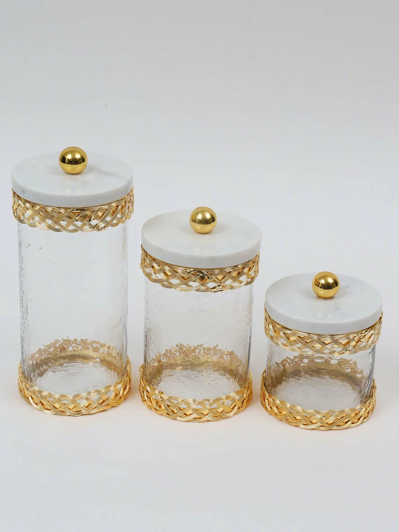 Description: These beautiful glass canisters have a golden lattice design and a marble top with a gold accent. What a stunning way to showcase on your coffee station, kitchen counter, or anywhere you need storage. These would look fabulous in your bathroom as well.