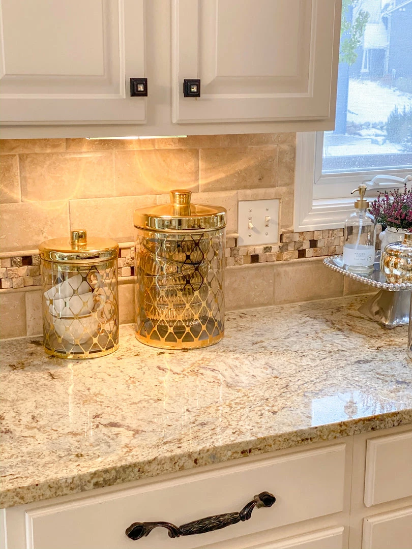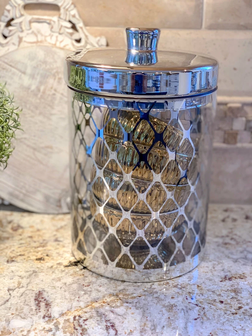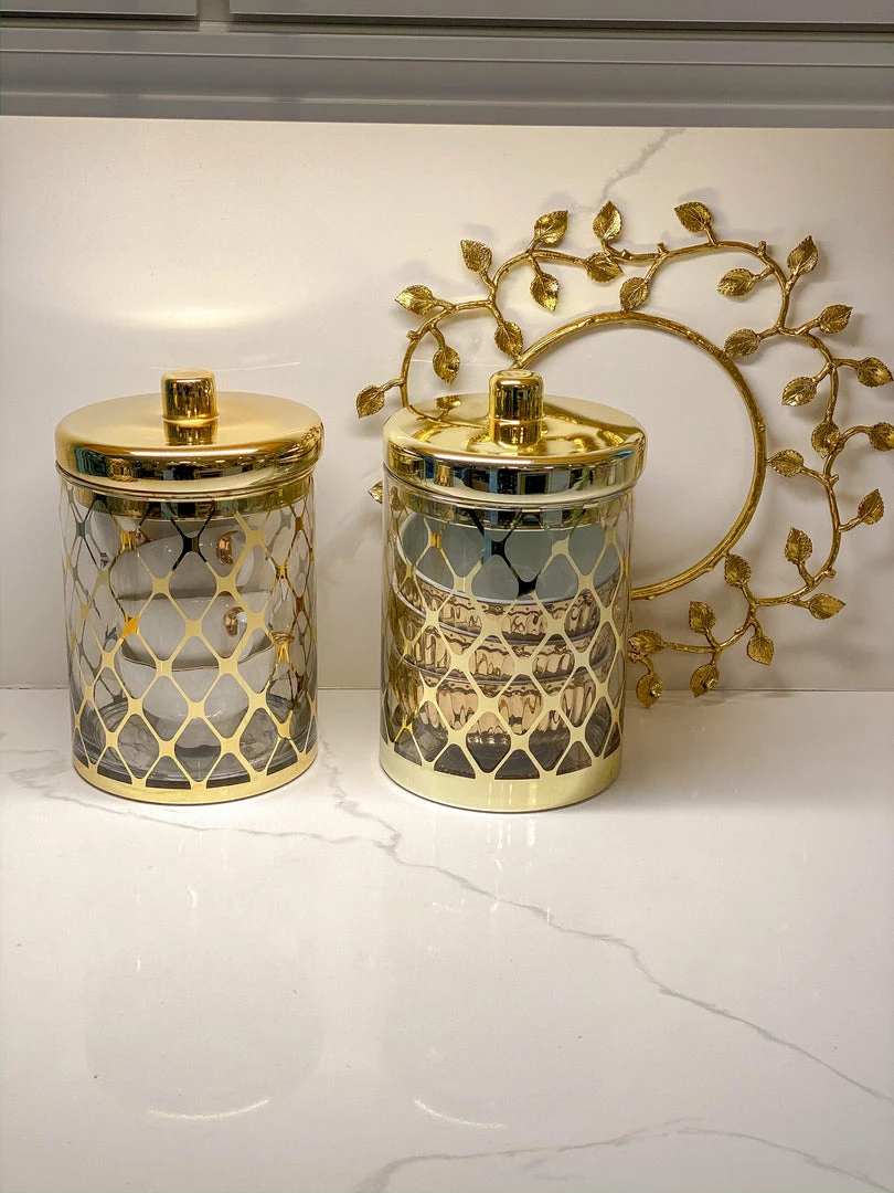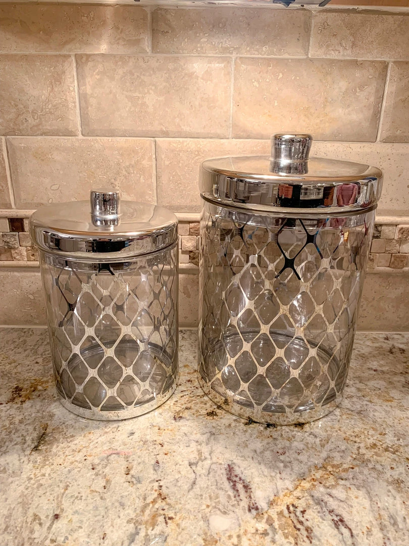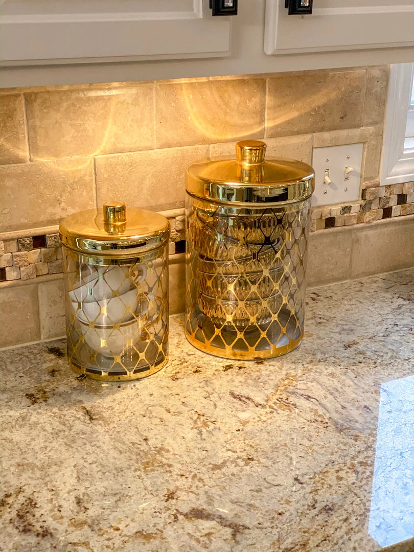 In Gold and in Silver, these glass jars are a classy touch to any countertop!