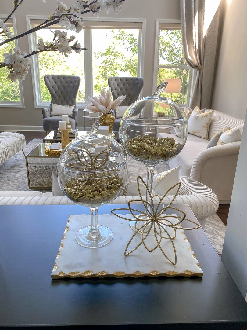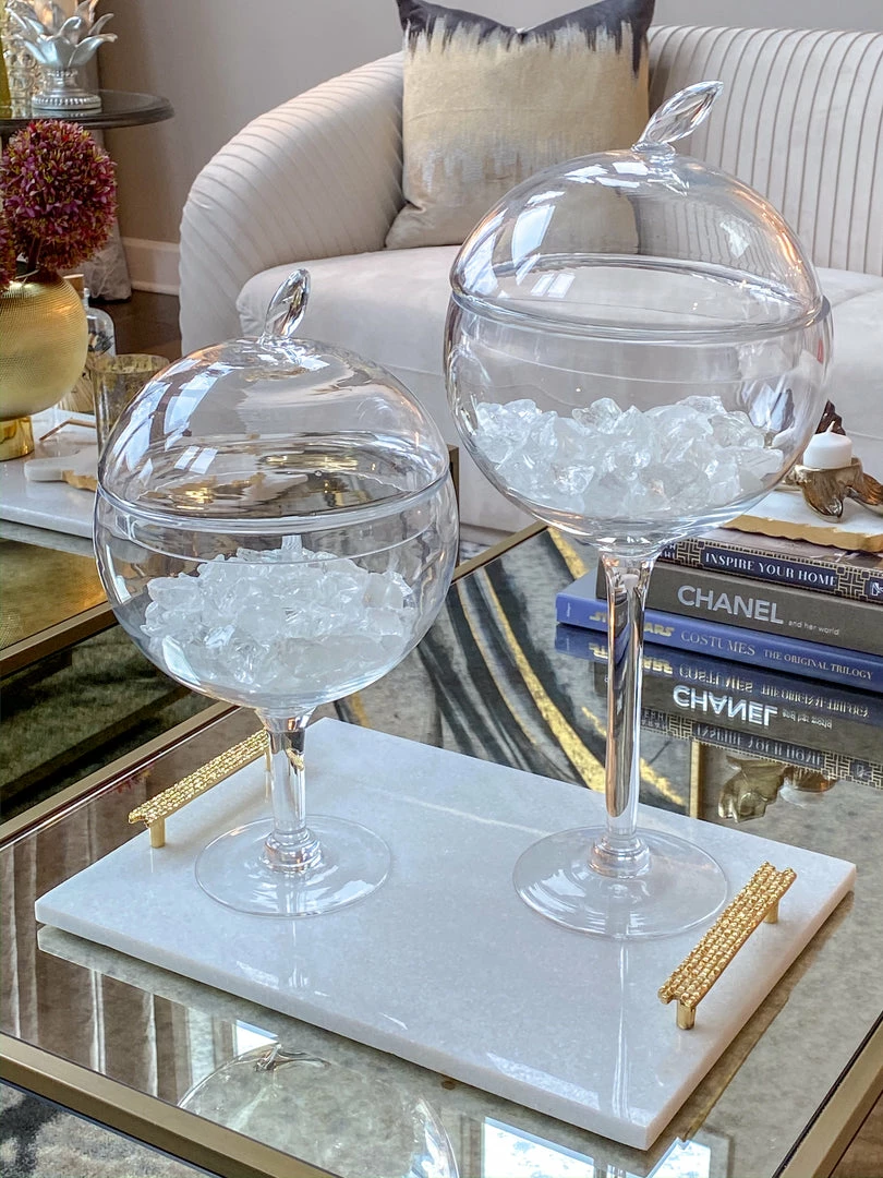 These apple stem jars can be styled as a set or on their own. They can be filled with candy, snacks, or even left empty! Farah has them styled with beautiful crystal stones and crushed gold glass!