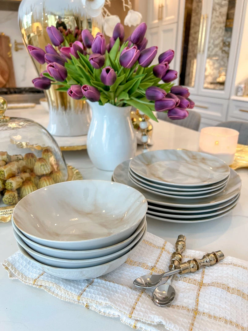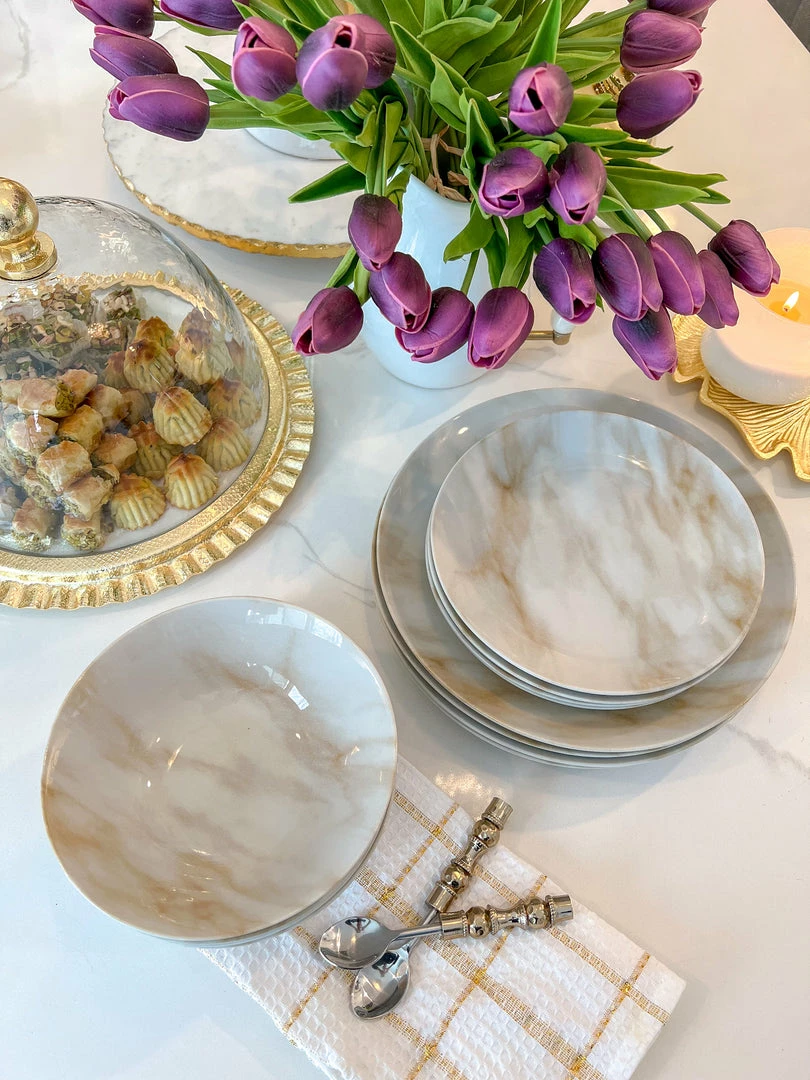 Description: This gold marbled print dinnerware set of 12 will make your table look stunning!