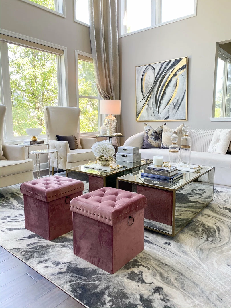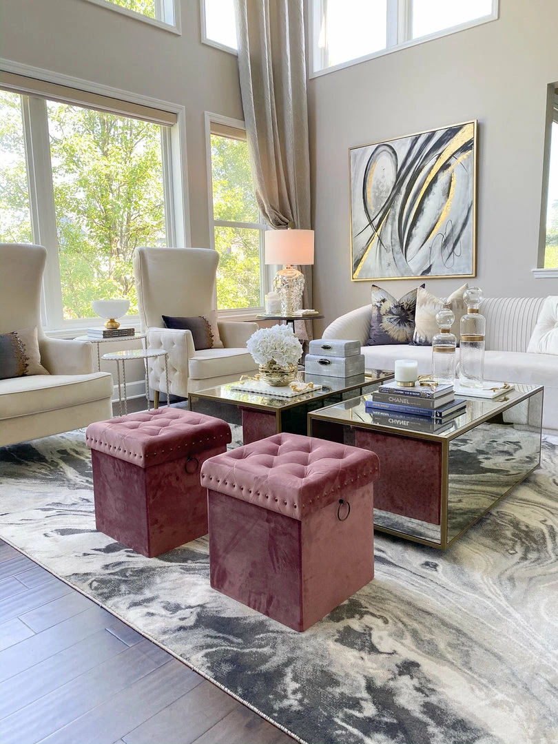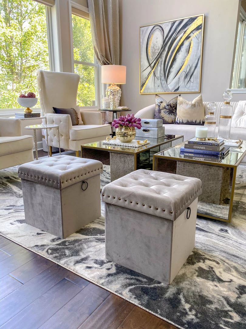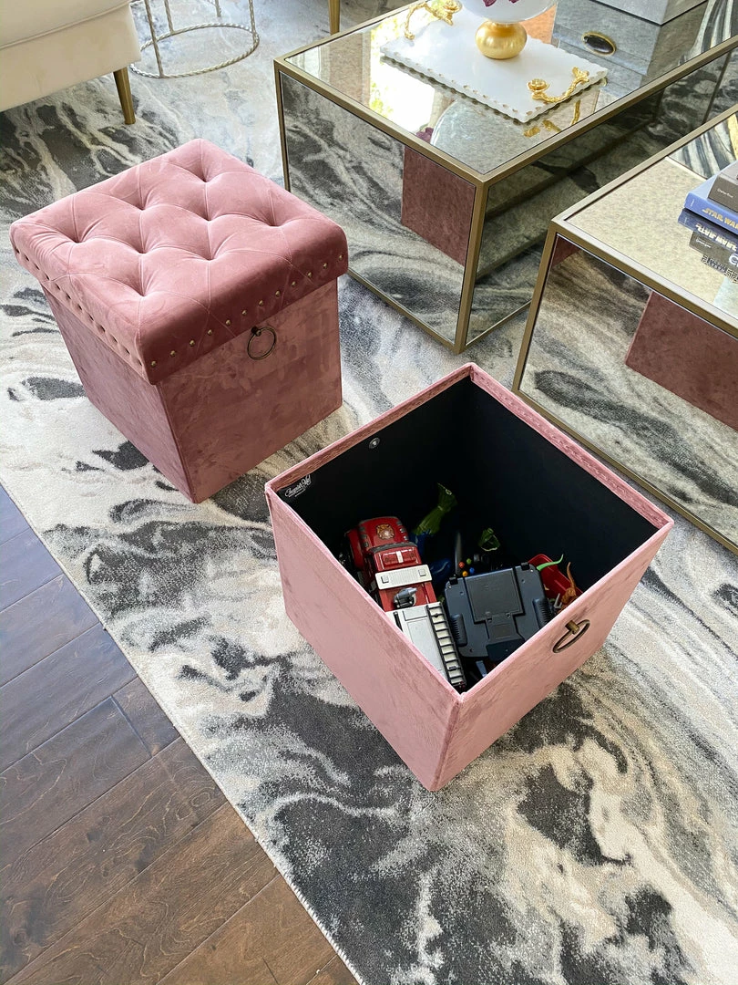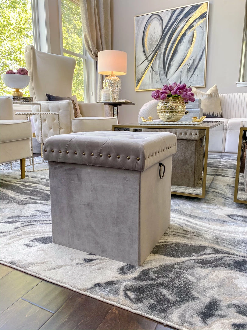 The Inspire Me! Home Décor Anastasia Ottoman features soft tufted velvet upholstery and is extremely versatile in its functionality. It provides comfortable seating for your family members and guests and allows items to be stored neatly inside simultaneously. You can also use it as a foot rest. It provides a good amount of space for hidden storage. Great for shoes, small toys, remotes, wires, and so much more. Featuring metal studs and handle detailing in brushed brass, it instantly adds a luxurious touch to your home. Use it in the entryway to sit down while you slip on your shoes in the morning, place it in your living room for extra seating, or use it in your bedroom as a beautiful accent piece. This ottoman assembles in just a few seconds and no tools are needed, so you can put it to use right away without worry. Moreover, it folds flat when not in use. Fantastic for your own space and also great as a housewarming gift because of its versatility and usefulness.