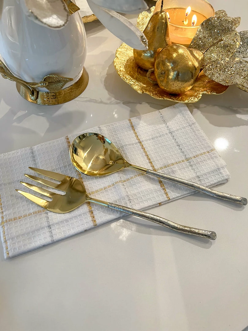 Description: This gold and silver serveware with their detailed handles are perfect for everything! They are so beautiful for a special occasions, any holiday or just for everyday dinners!