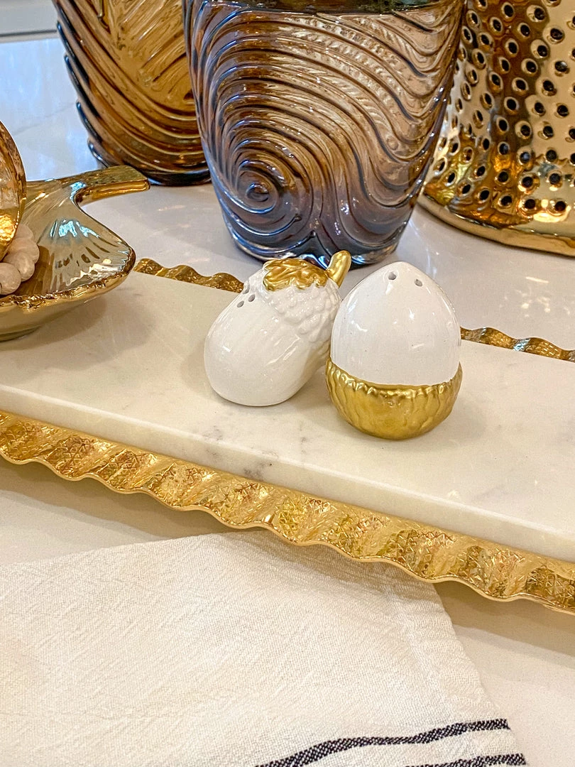 Description: This gold-trimmed acorn salt and pepper set makes a stylish addition to any dinner table. Crafted out of white ceramic with gold accents, the minimalist style of these shakers is complemented by their simple but evocative texture.