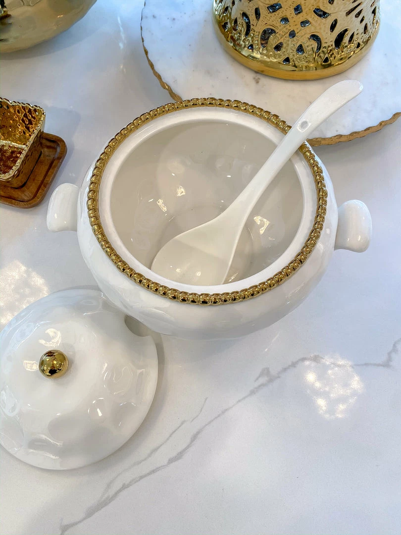 Description: This high quality porcelain is a miracle material! It is food safe, dishwasher safe, and oven safe up to 350 degrees! Made in Argentina, this beautiful porcelain is also tarnish free, scratch/stain resistant, will not lose its beautiful luster, and is perfect for everyday life! Baking and serving never looked so good! This beautiful white textured soup serving bowl with gold beaded trim is a wonderufl addition to your baking and serveware! Food safe and oven safe, this piece is as stunning as it is functional!