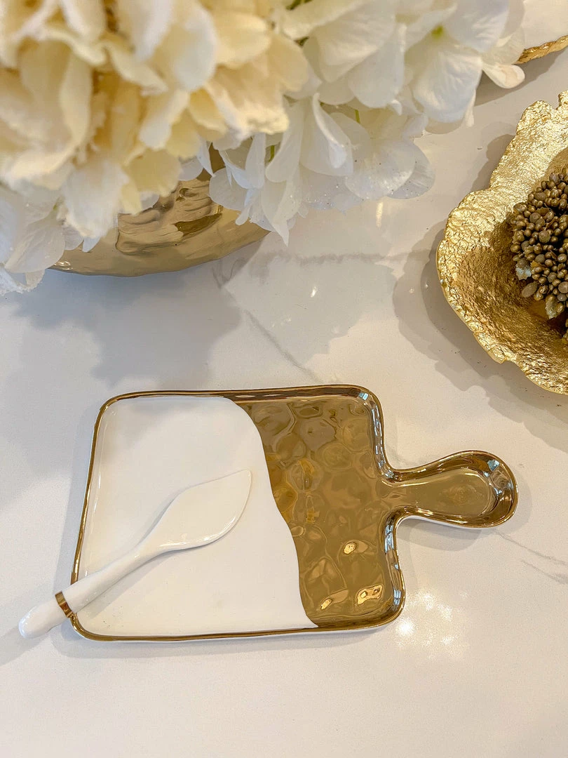 Description: What a stunning set this is. The tray and spreader are made of gorgeous white porcelain with gold titanium accents and trim. Use this to serve up your favorite treats in style.