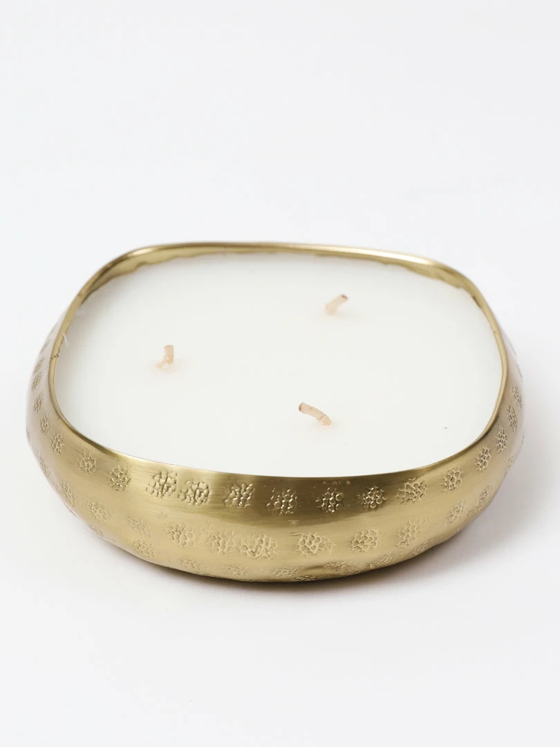 Description: This beautiful gold candle tray is available in 2 sizes. This is a serene Cashmere scented organic soy candle. Burn time is 30 hours for the small 3 wick and 16 hours for the large 6 wick.