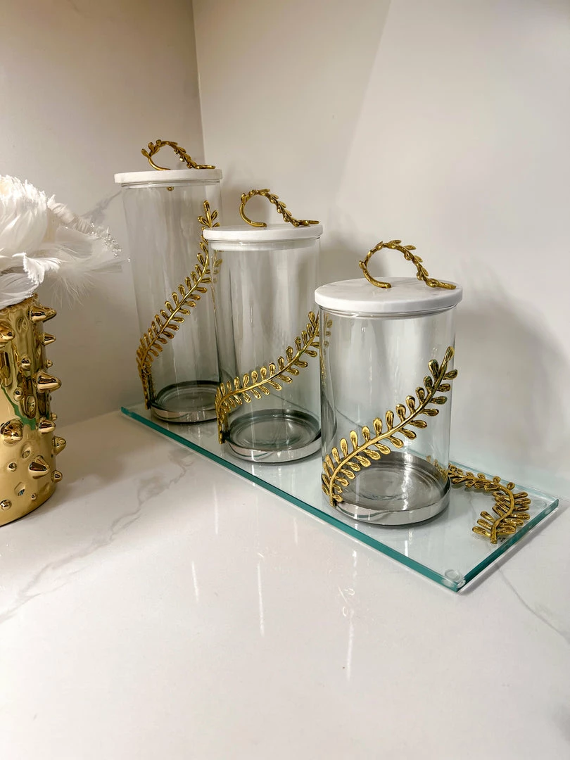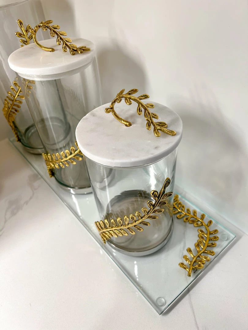 Description: This glass canister with a marble and curry leaf lid is just what you were looking for! Enhance your display with these canisters.