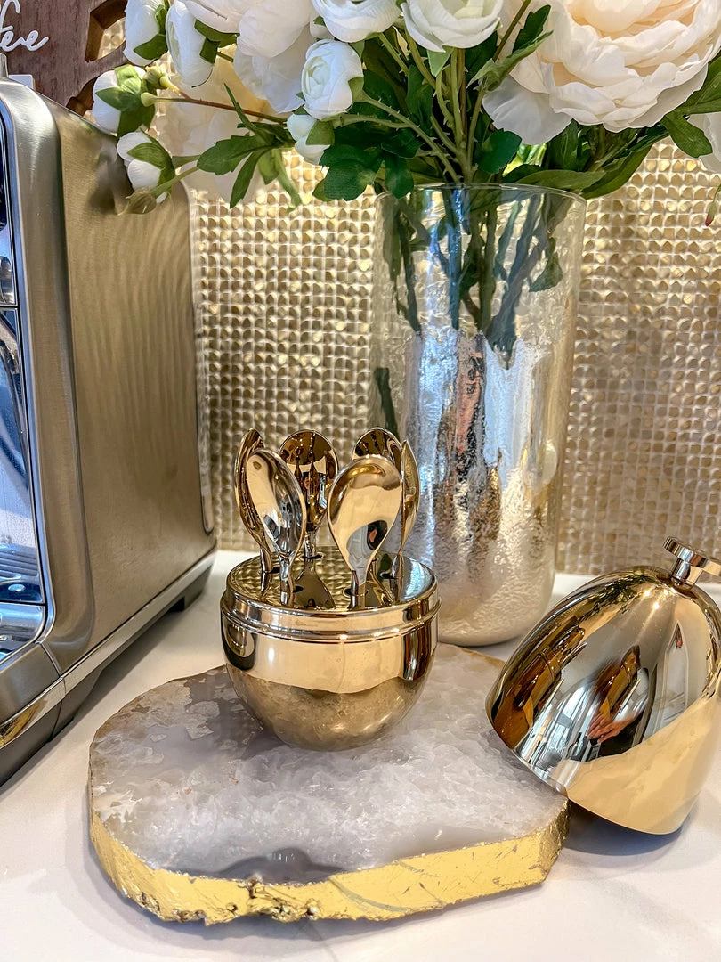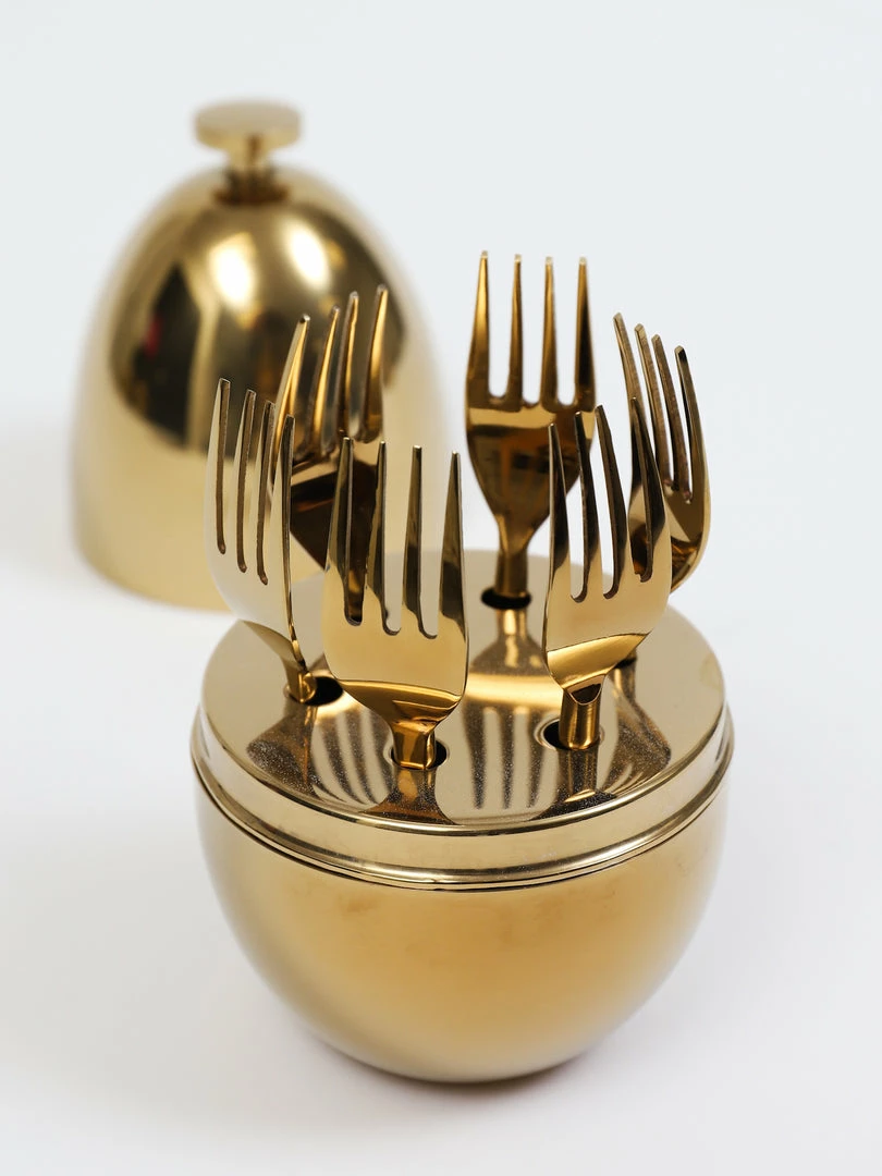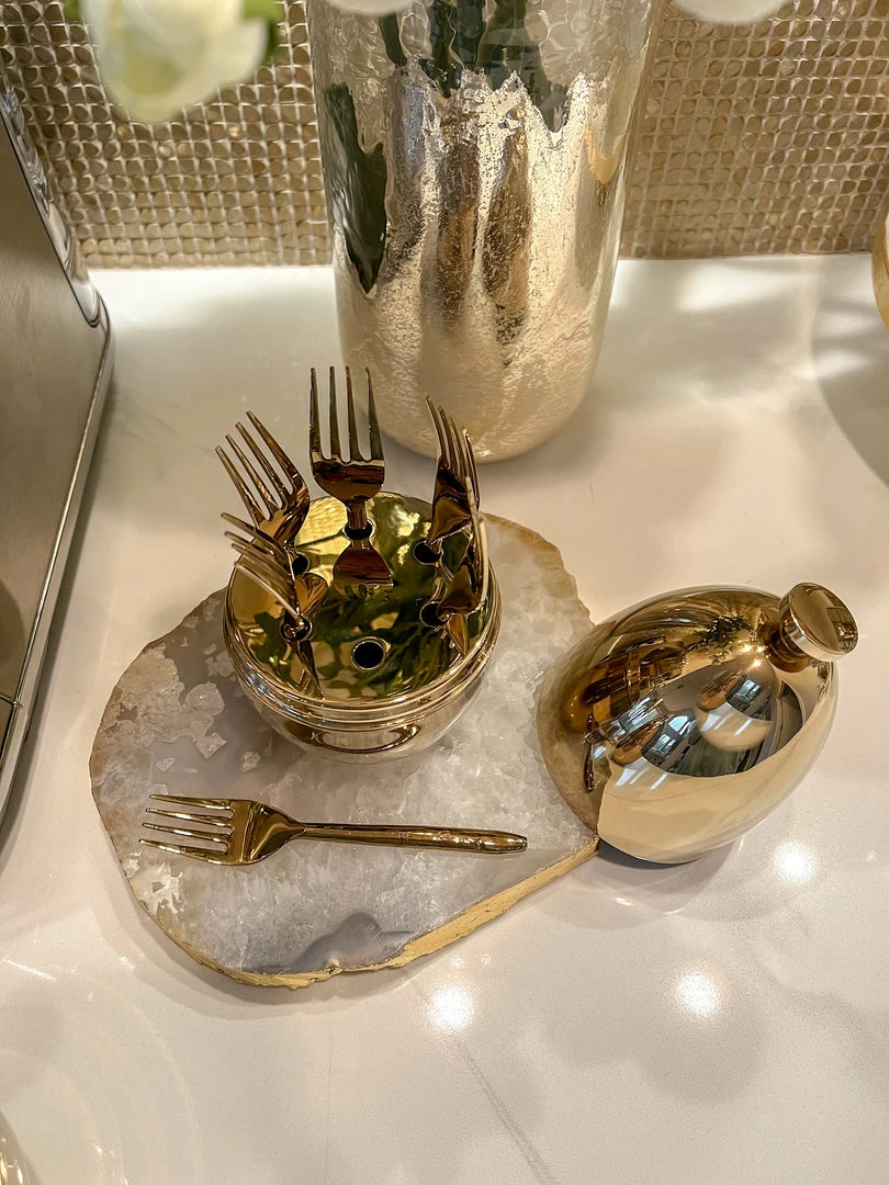 Description: These egg shaped gold shiny utensil holders are sold in 2 styles. One holds hammered tea spoons and one holds hammered mini forks. These are the cutest way to style your utensils on your coffee station or with your snacks.