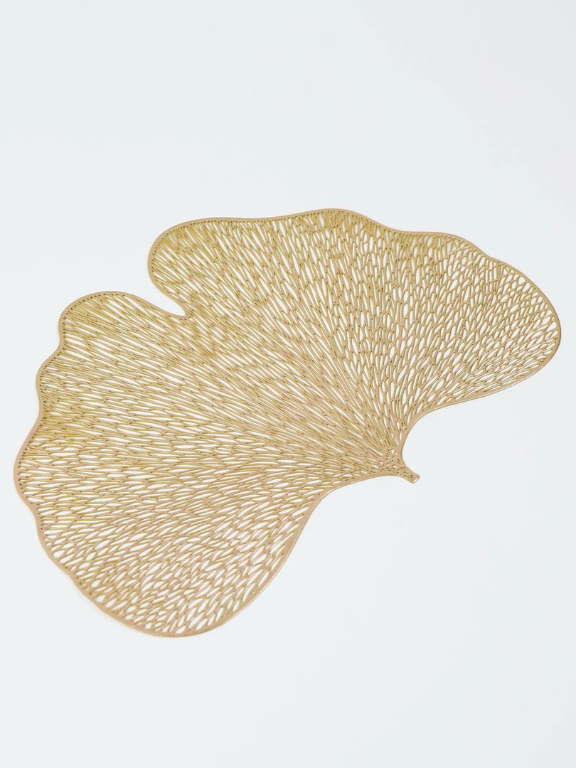 Description: This gold table mat features the shape of the Ginko leaf and is the perfect addition to your dinner table!