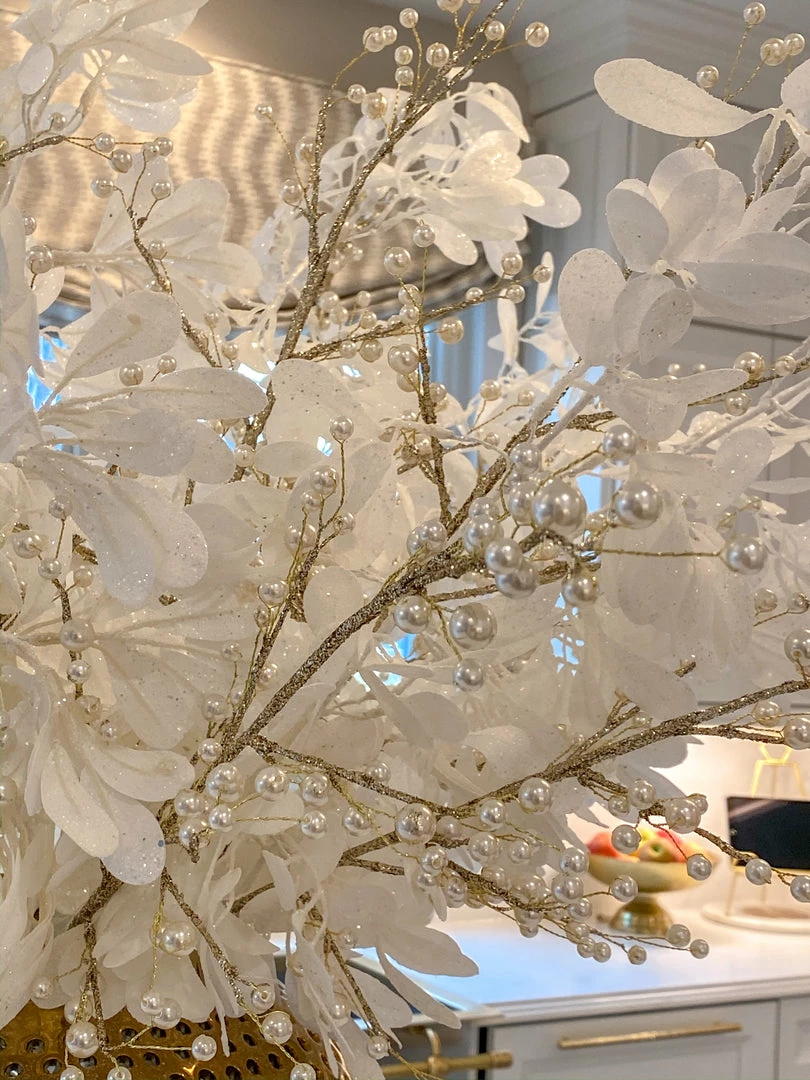 Description: This gold branch stem is covered in gold glitter with pearls. Ties back perfectly to our pearl trees and pearl wreaths!