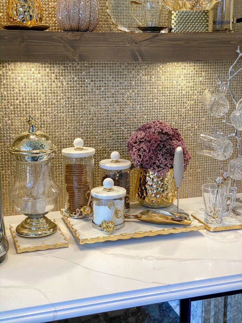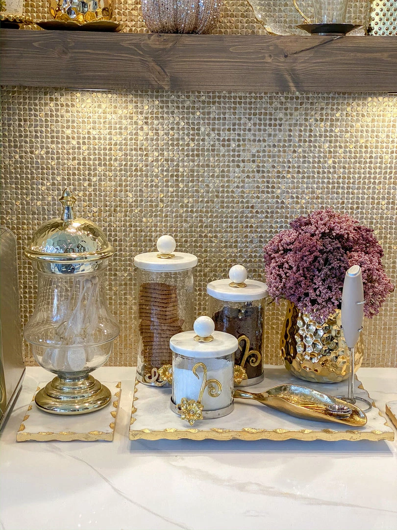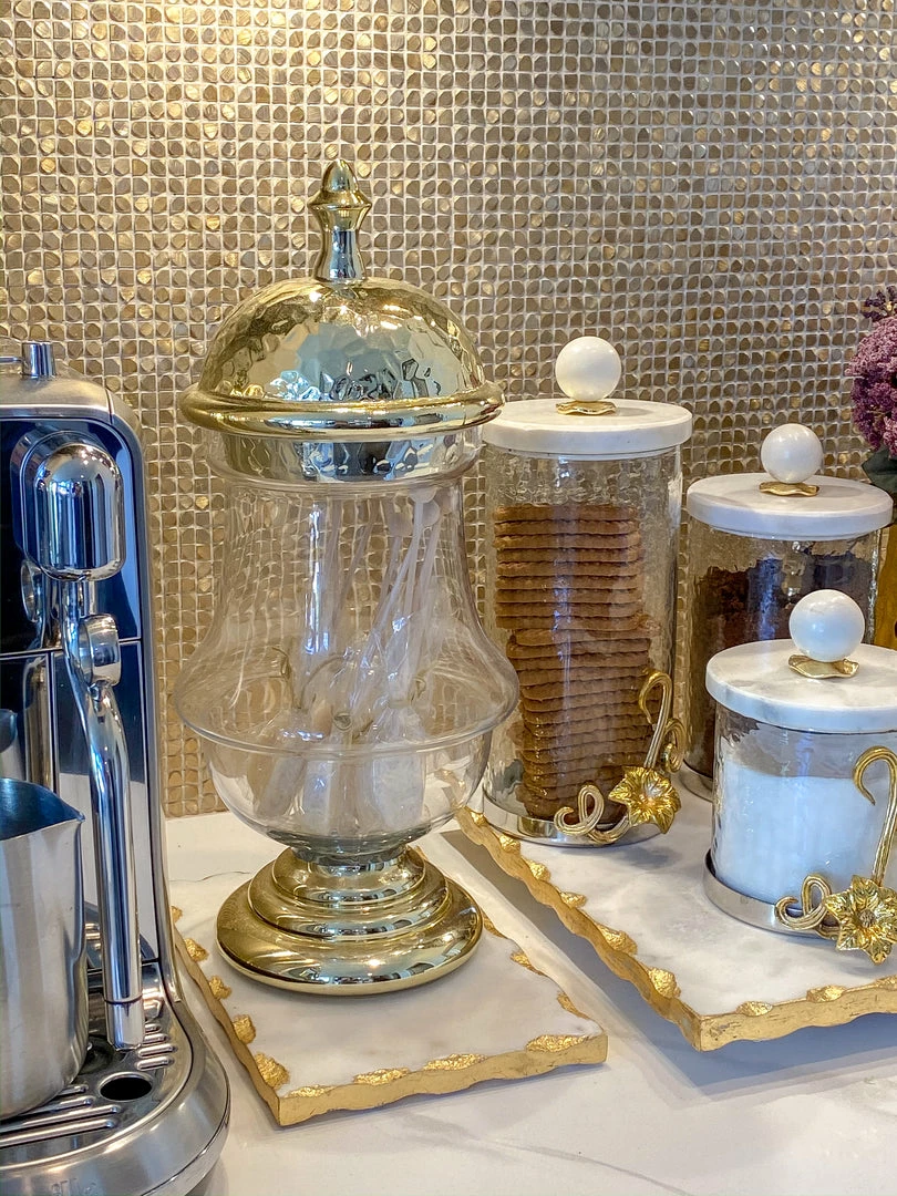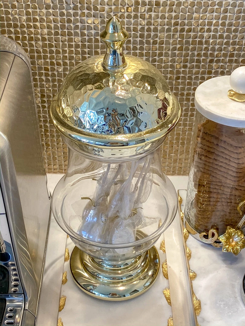 This apothecary jar is a favorite among many! The hammered lid brings some glamour to your coffee station! Fill it with your favorite snack to wow your guests or use it as a vase!