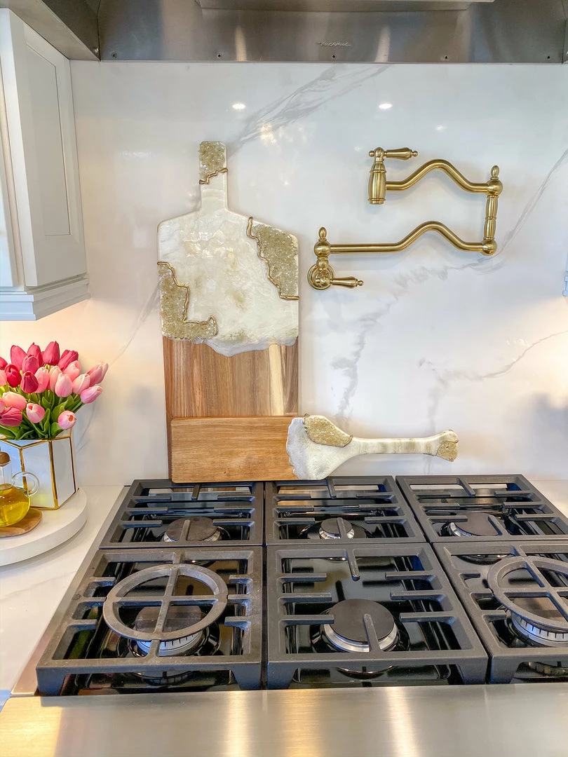 Description: This wooden paddle serving board will add a unique elegance to your serving display! Each piece is handmade with a glossy resin finish featuring gold and white colors and encrusted with clear shimmering stones.