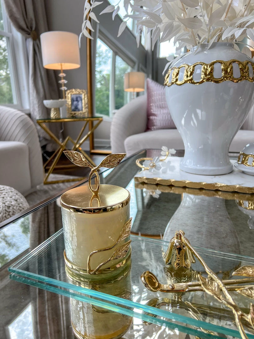 Description: This is a stunning gold ensemble. Style with your favorite IMHD trivet or marble tray and make a gorgeous vignette!