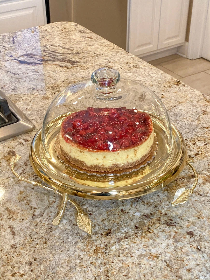 Description: Gold metal and glass cake stand. Cake holder is removable for easy washing!