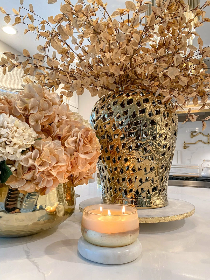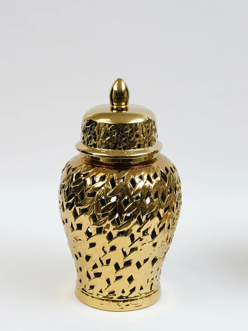 Description: This gold cut-out ceramic ginger jar is perfect for any decor! The design features a leaf texture with floral details, to give it a whimsical garden look! Available in 2 sizes. Priced for one Ginger Jar.