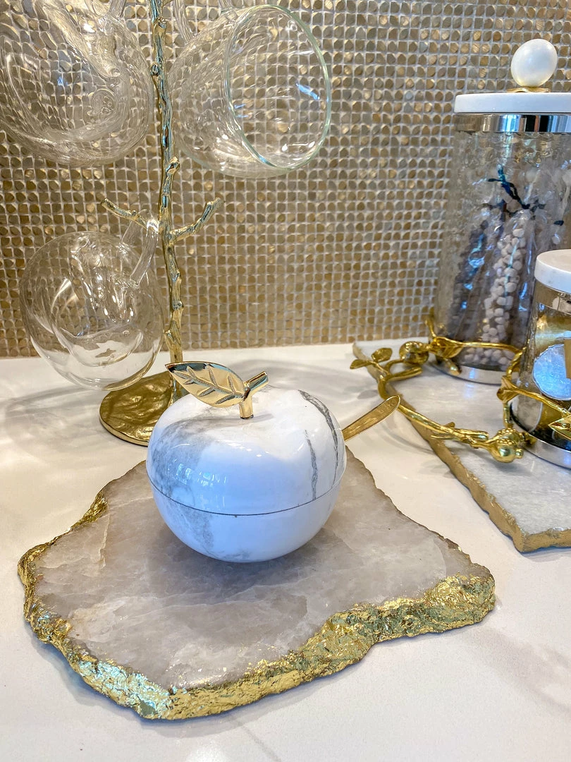 Description: This marbled metal apple dish comes with a small spoon so serve your favorite snacks or dip! The apple dish is accented with a gold leaf and stem and a gold metal spoon!