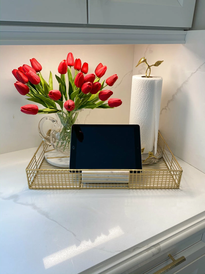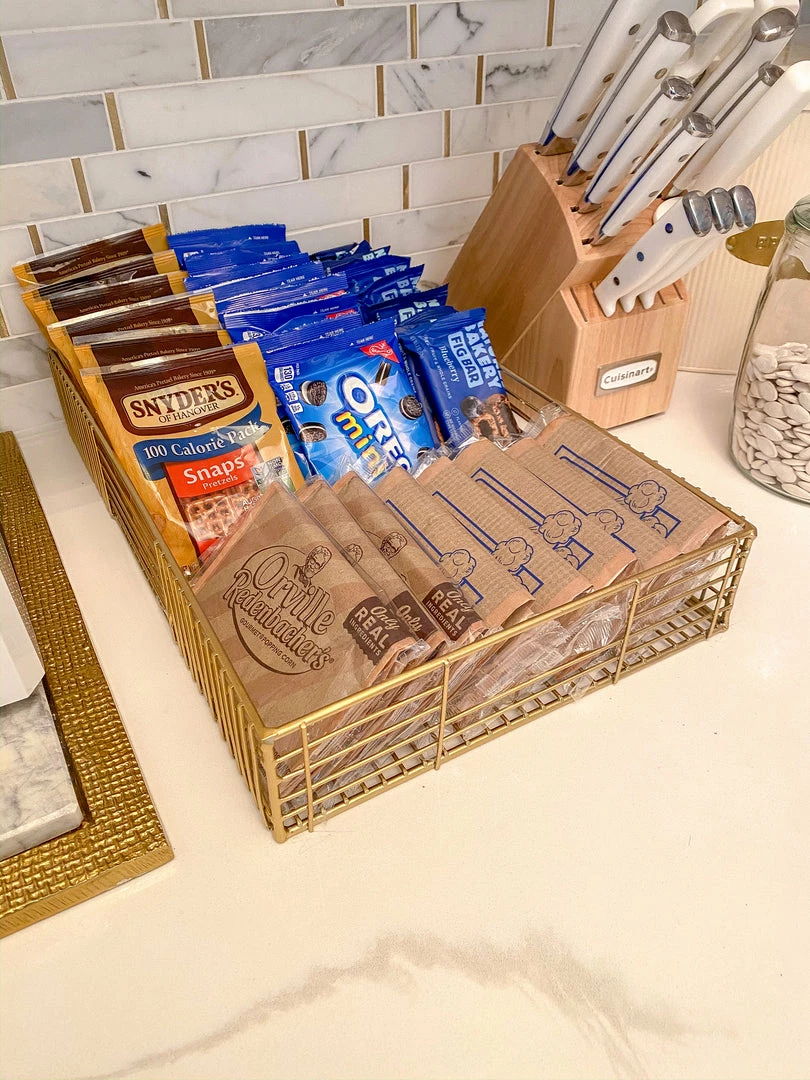 Description: This set of two metal basket trays are perfect for your linen closet, shelves, or restroom organization. We love that it has a glam look while still being functional!