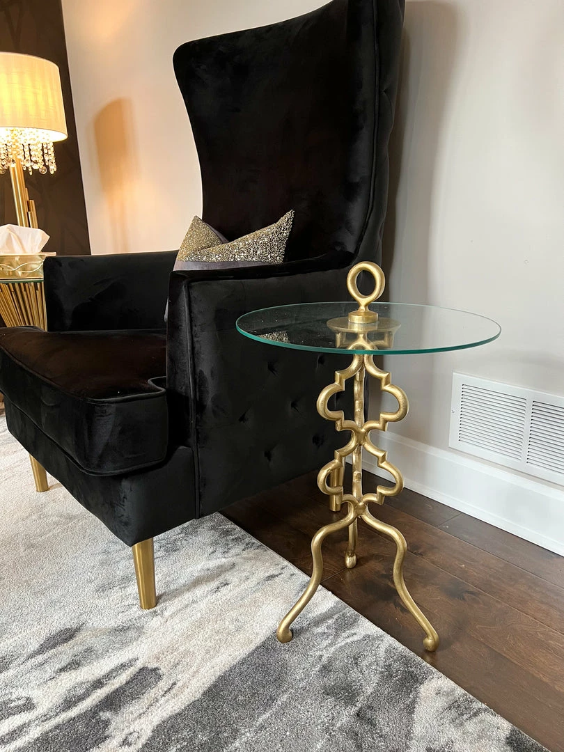 Description: This side table is so stunning! We love the intricate gold design of the base alongside the sleek glass top.