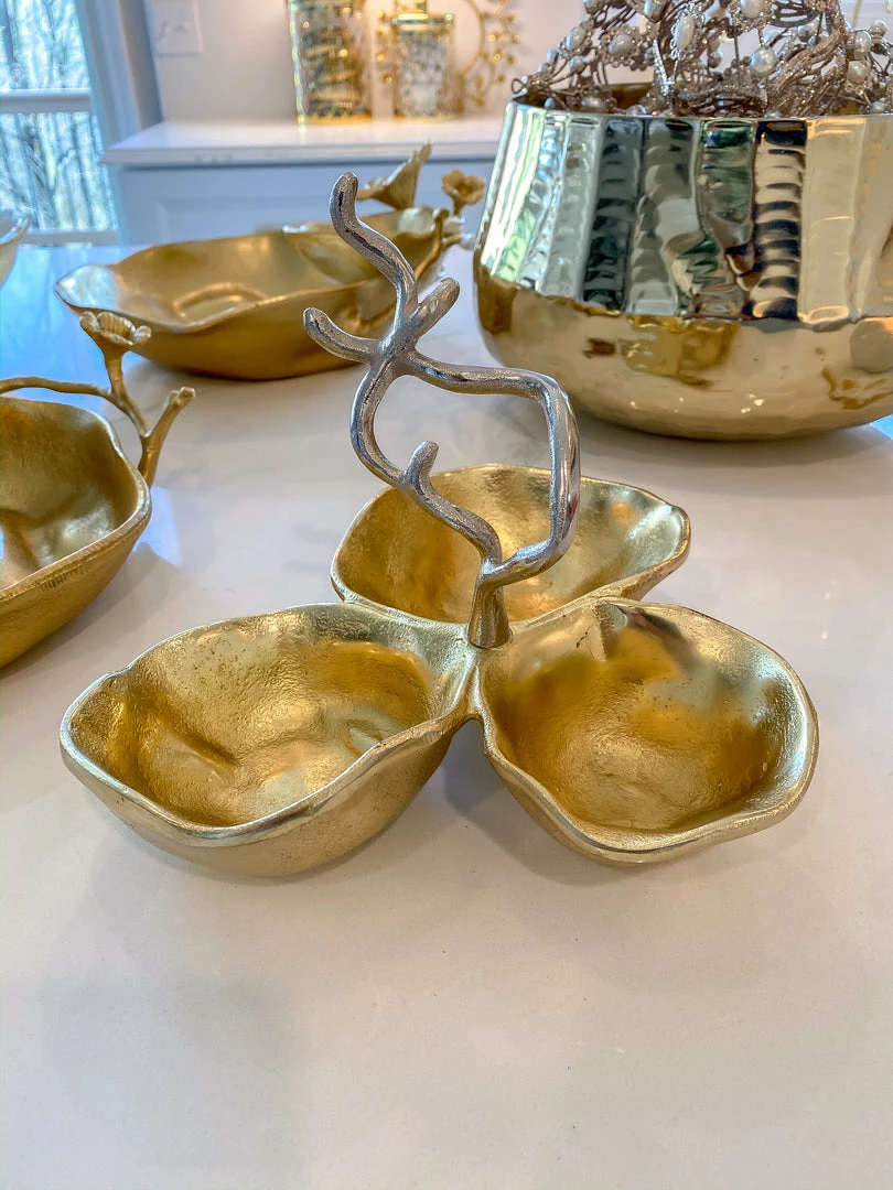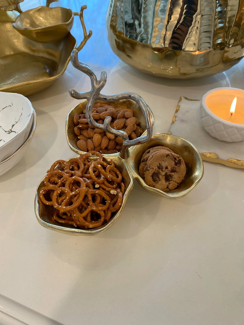 Description:Â This gold metal triple snack bowl is a stunning piece for entertaining or for everyday use and features a silver floral handle that threads into the center.