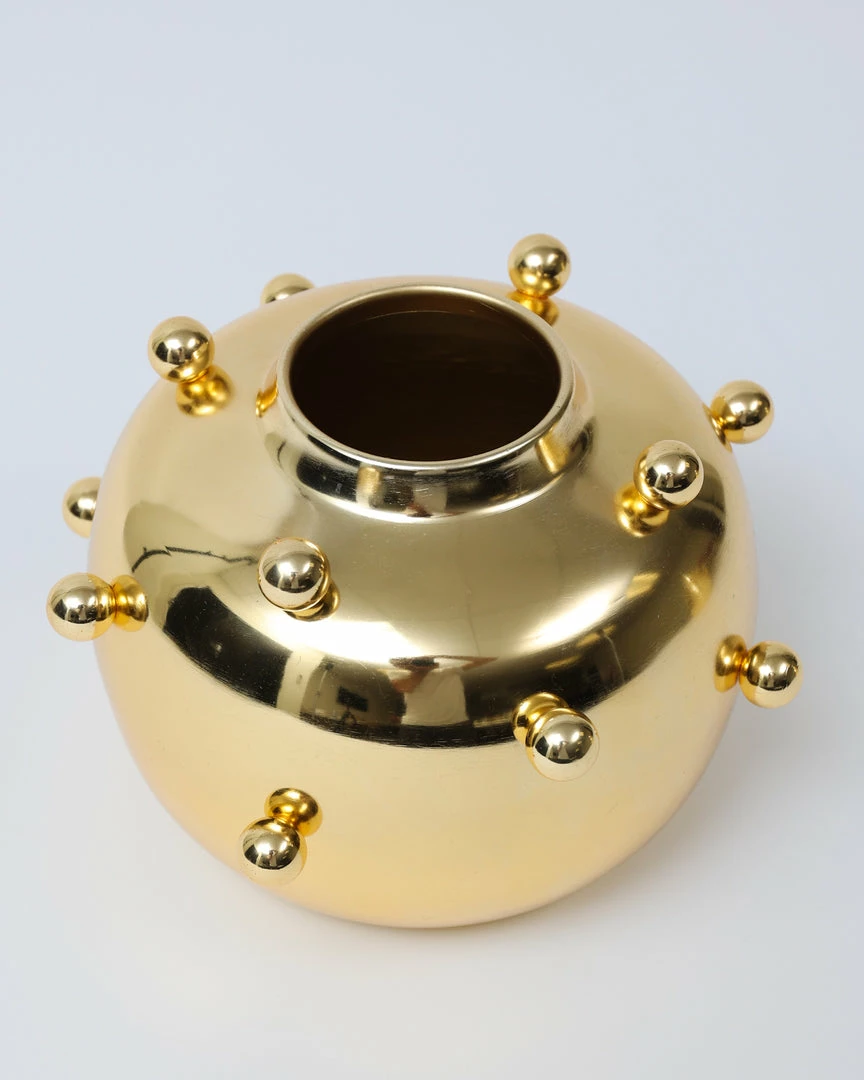 Description: This unique metal-studded gold vase is sure to attract attention. Fill with your favorite faux florals and make a statement in any room!