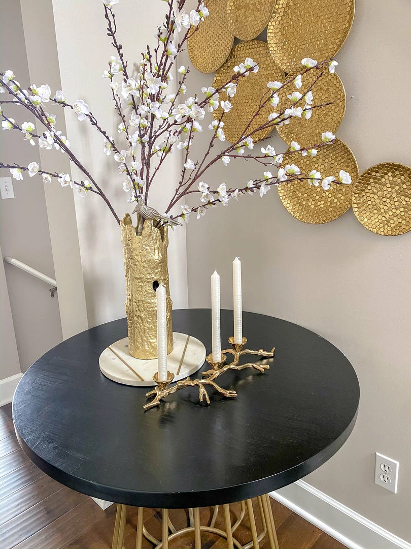 Description: This gold metal “tree” vase features a bark-like gold finish and a small silver bird. It is a great way to introduce some nature into your decor!