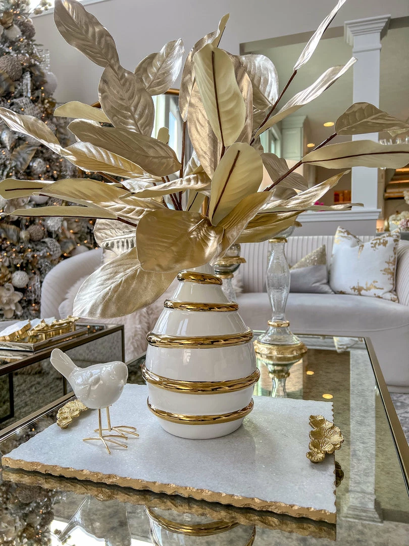Description: This Gold Metallic Magnolia Leaf Stem will add a touch of glamour to your holiday displays or floral arrangements all year round!