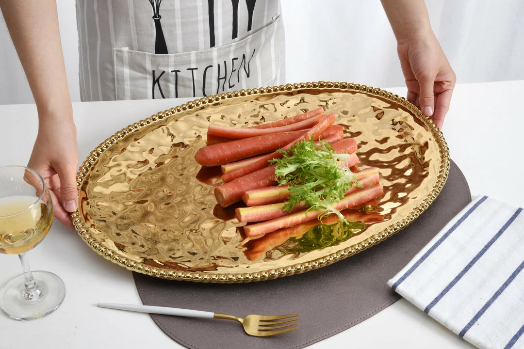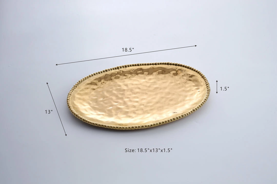 Description: This high quality porcelain is a miracle material! It is food safe, dishwasher safe, and oven safe up to 350 degrees! Made in Argentina, this beautiful porcelain is also tarnish free, scratch/stain resistant, will not lose its beautiful luster, and is perfect for everyday life! Baking and serving never looked so good! This oval beaded platter has a beautiful hammered texture and can be used for serving or for displaying your decor! Ties back perfectly to our other gold beaded porcelain items.