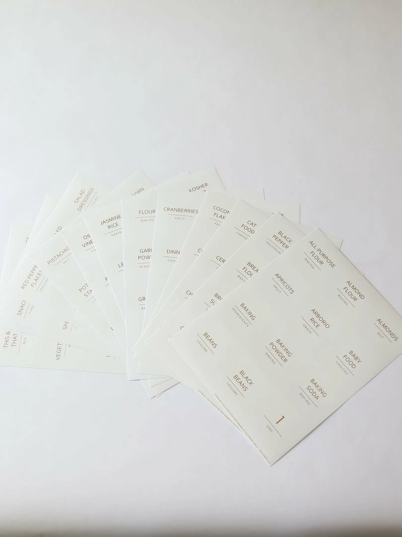 Description: Organize your pantry in style with these gold and white pantry labels! Each set contains 144 labels, 12 numbers, and an alphabetical reference sheet of all the itemized labels! The labels include but are not limited to: chocolate ships, coffee, all-purpose flour, noodles, and many more!