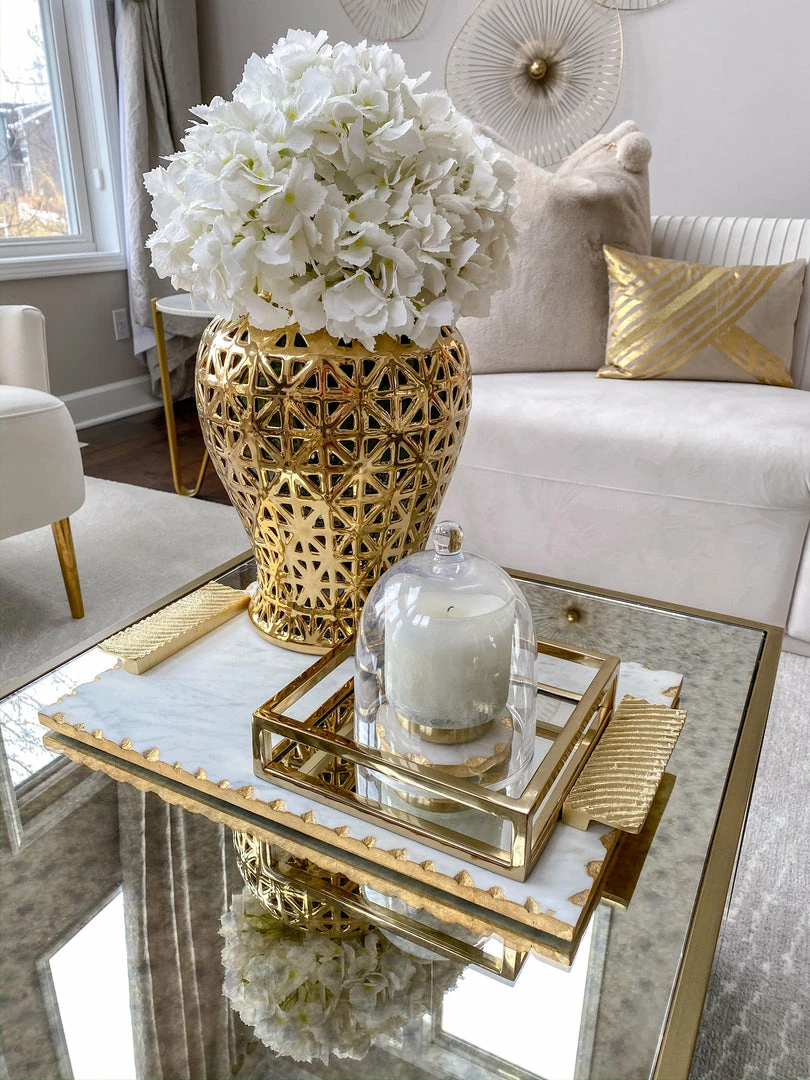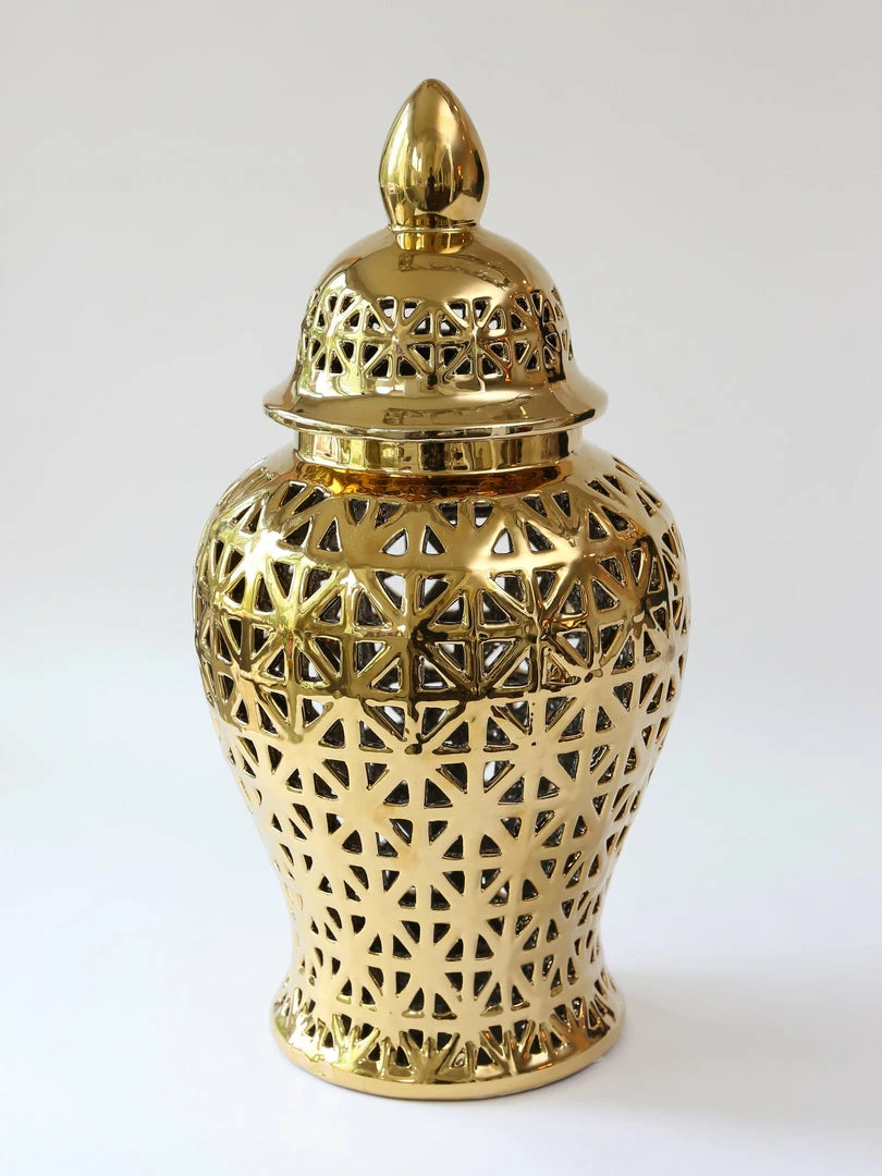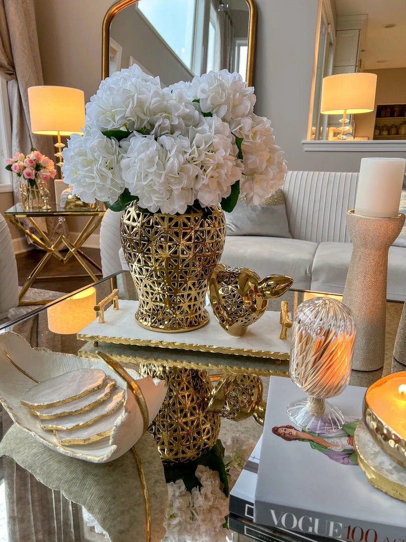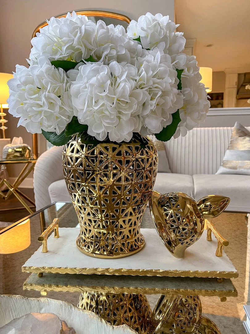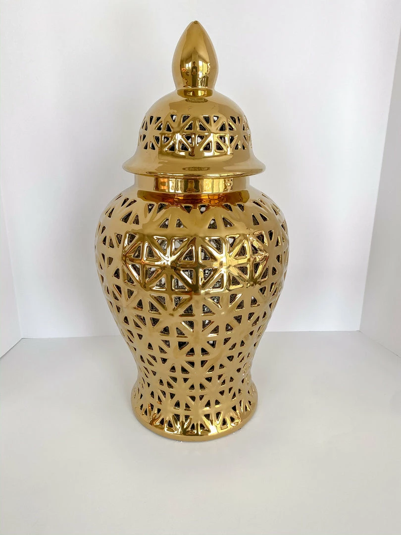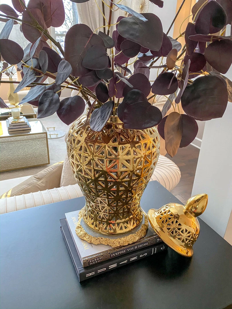 Descriptions: Ginger jars are an easy way to add unique elegance into your home decor! This gold ginger jar will look beautiful styled with your favorite flowers, or on its own display.