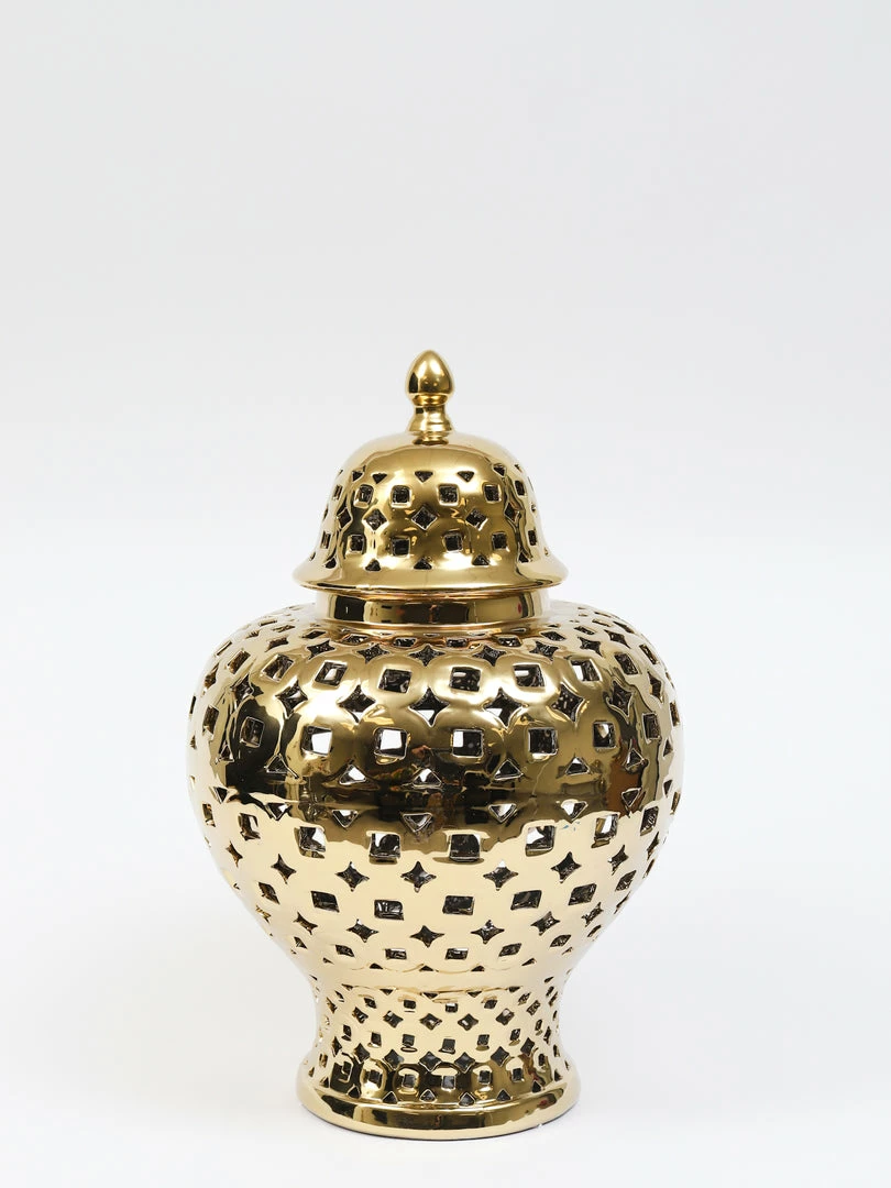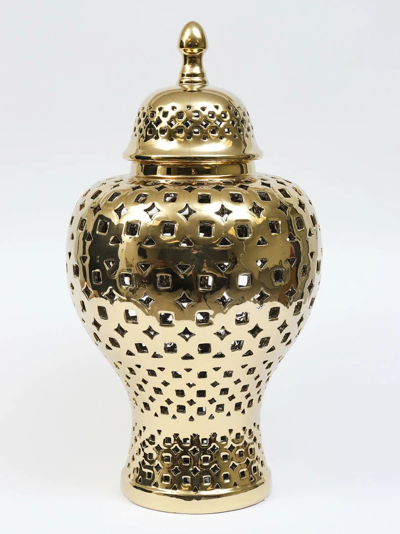 Description: This Gold pierced ginger jar will make a great addition to your home decor! Displayed with your favorite florals or on its own, either way, this piece will make a dynamic centerpiece!