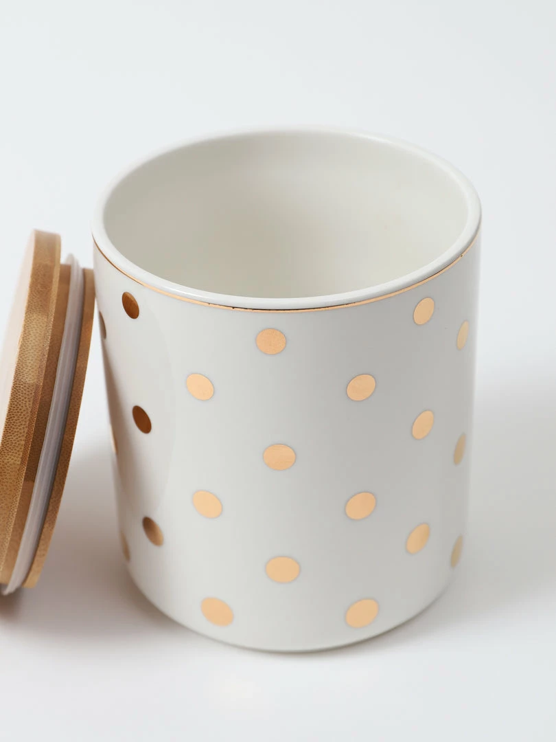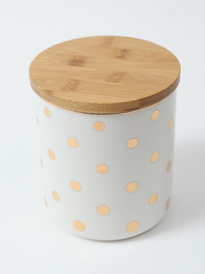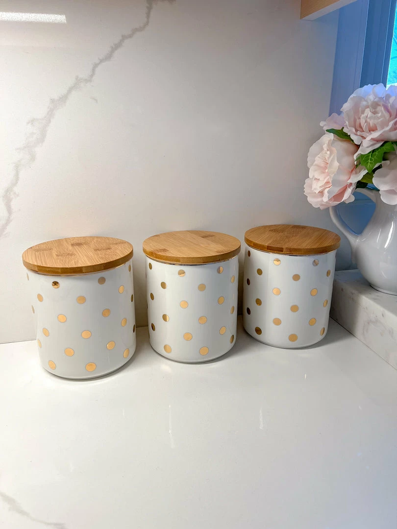 Description: The is a versatile white canister jar with a wooden top and can be used for so many things, cookies, snacks, dog treats, you name it! and it will look so cute! Each sold separately.